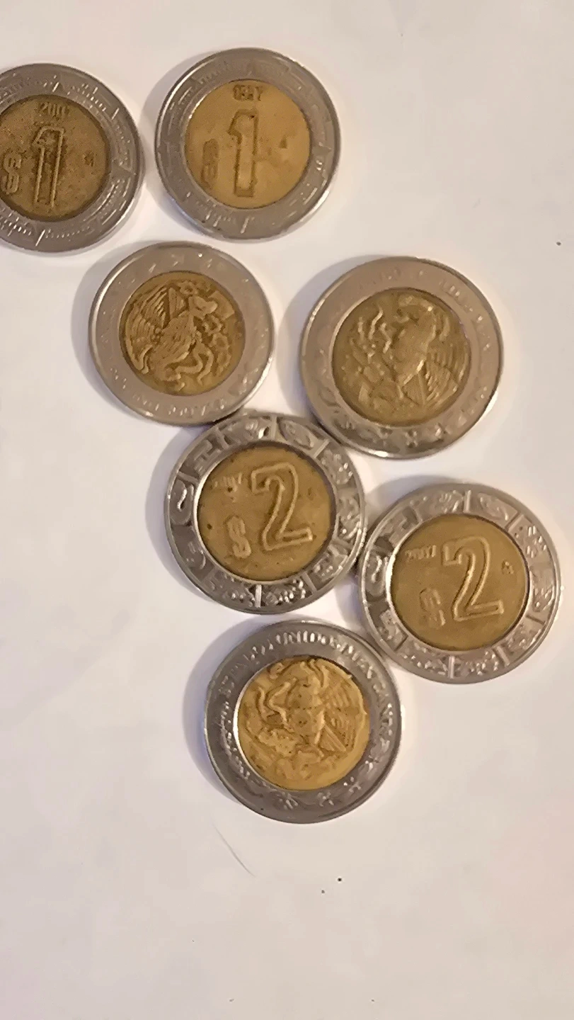 Three $1 peso coins from 1997, 2007, and 2003, plus four $2 peso coins from 2007. These coins are bimetallic with a gold-coloured centre and silver-coloured outer ring. They feature national emblems.