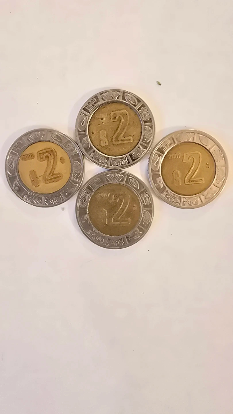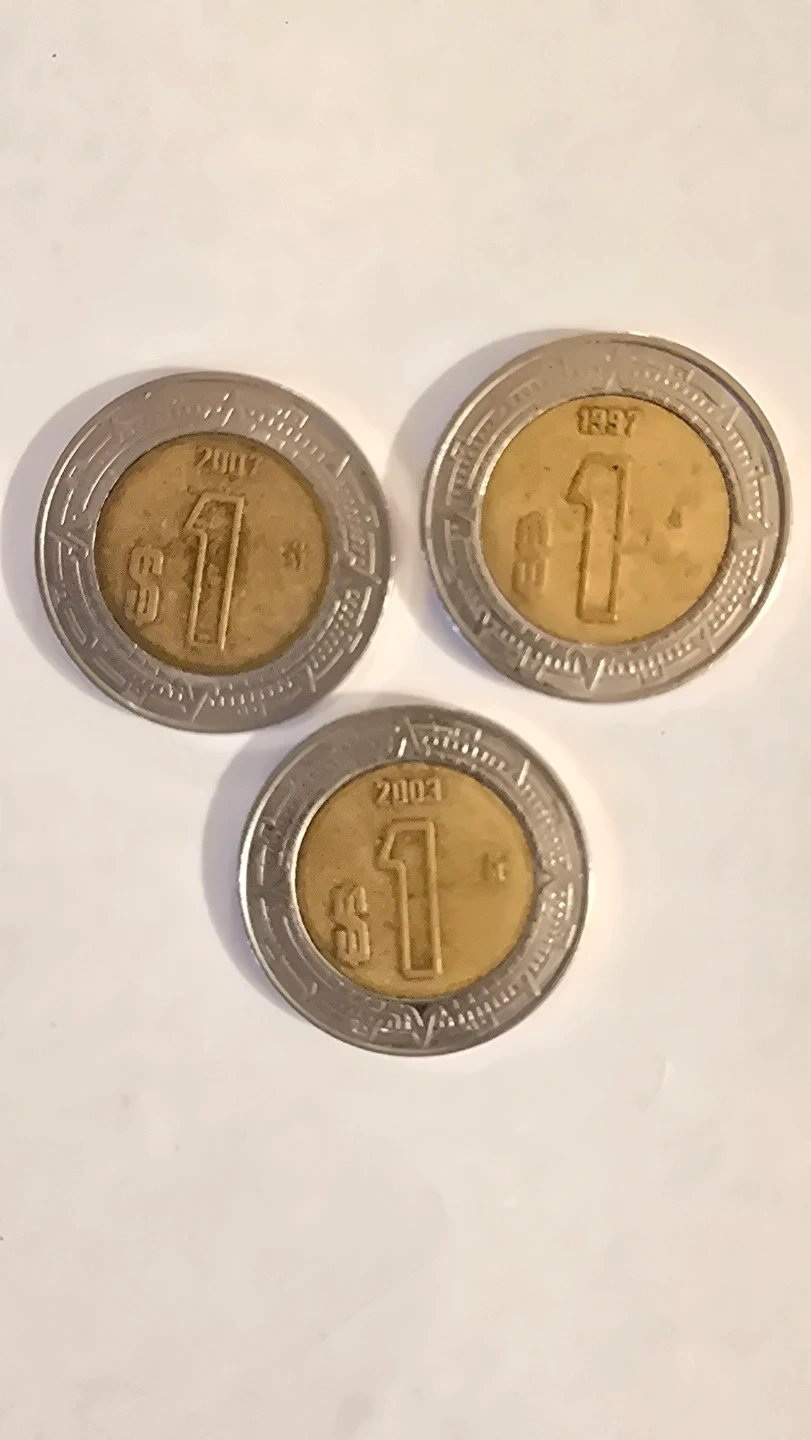 Three $1 peso coins from 1997, 2007, and 2003, plus four $2 peso coins from 2007. These coins are bimetallic with a gold-coloured centre and silver-coloured outer ring. They feature national emblems.