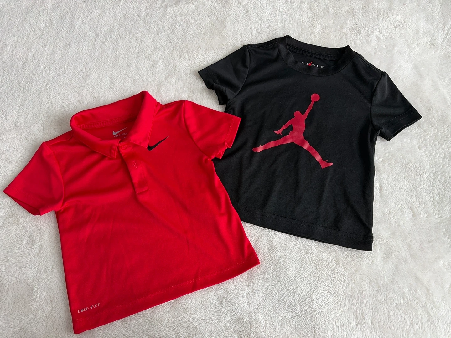 Selling a couple of cute shirts for kids! One is a red Nike polo shirt, and the other is a black Jordan t-shirt with the iconic Jumpman logo. Both are in great condition and ready for a new wardrobe!