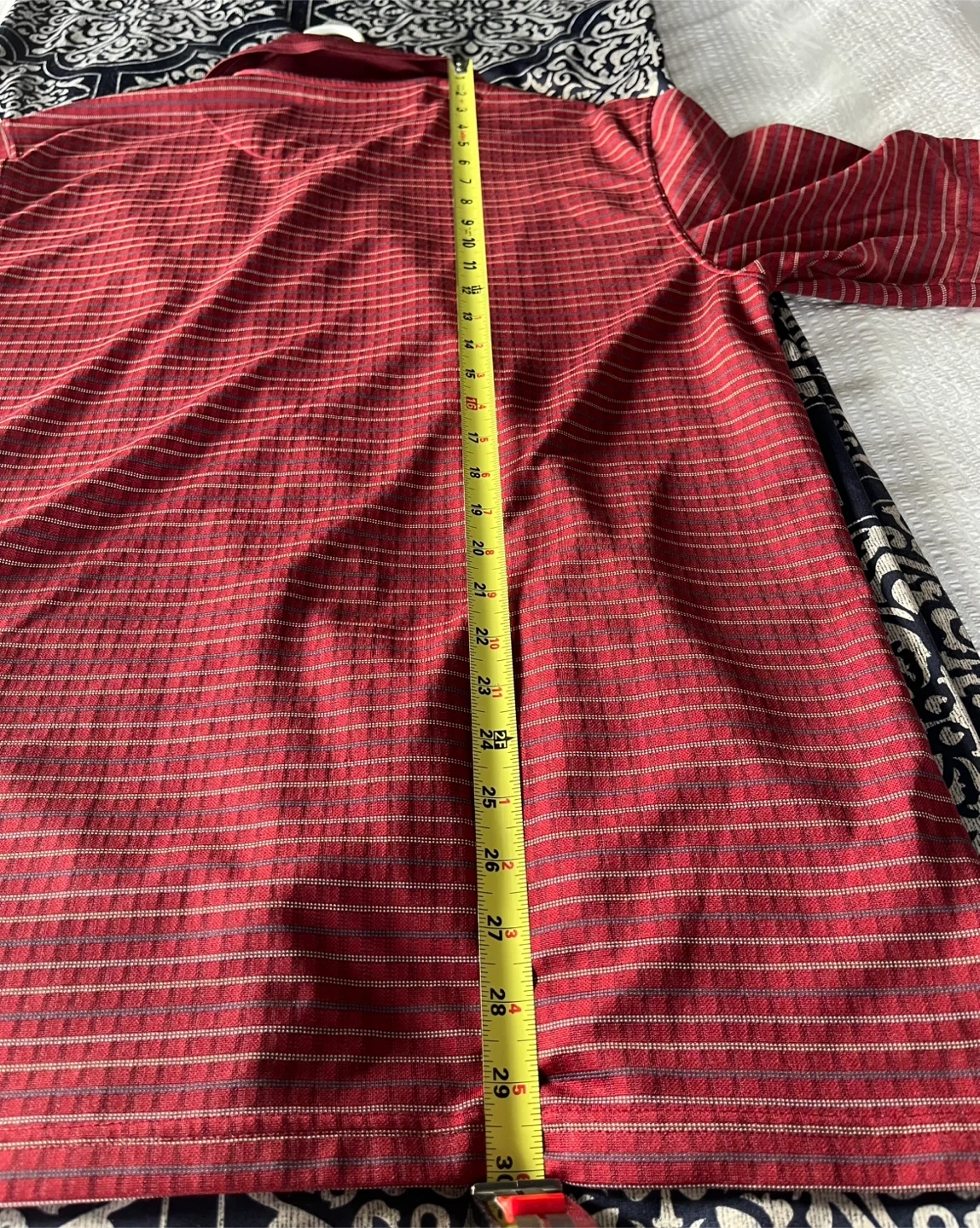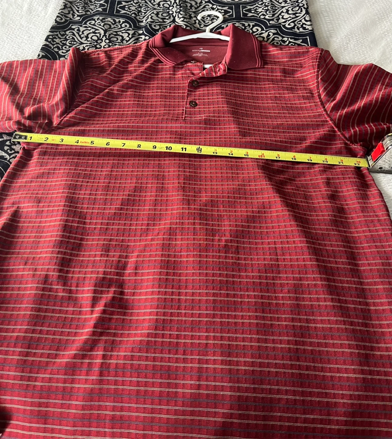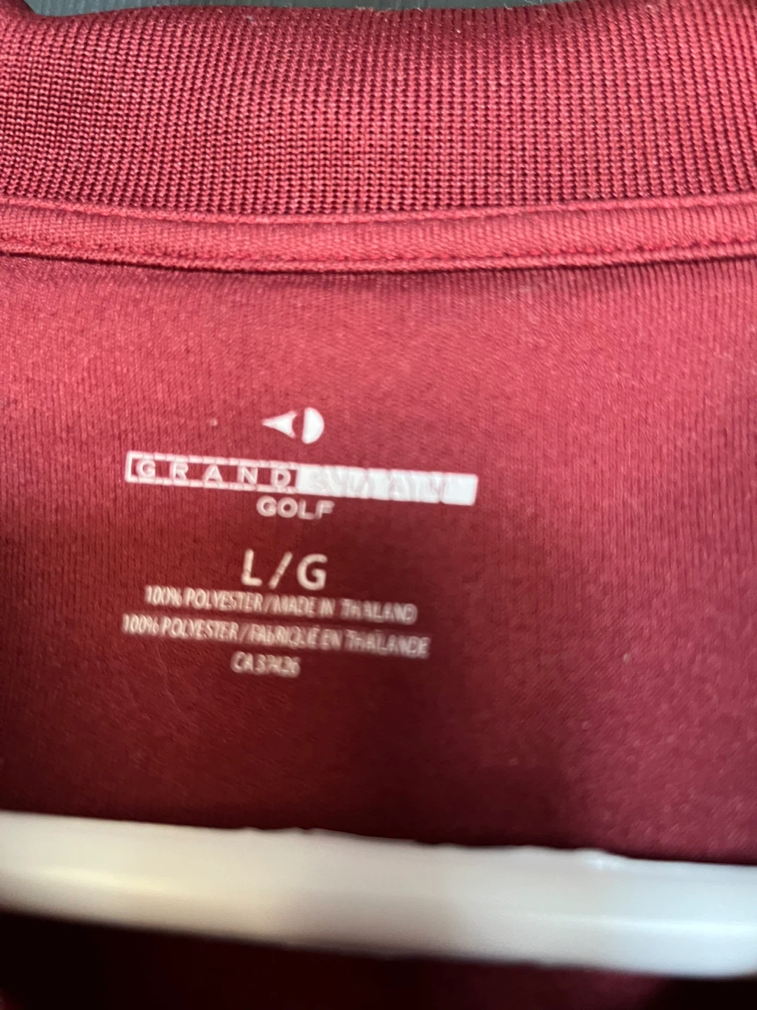 This is a men's Grand Slam Golf polo shirt in red with thin horizontal stripes. It's made of 100% polyester and is a size Large (L/G).