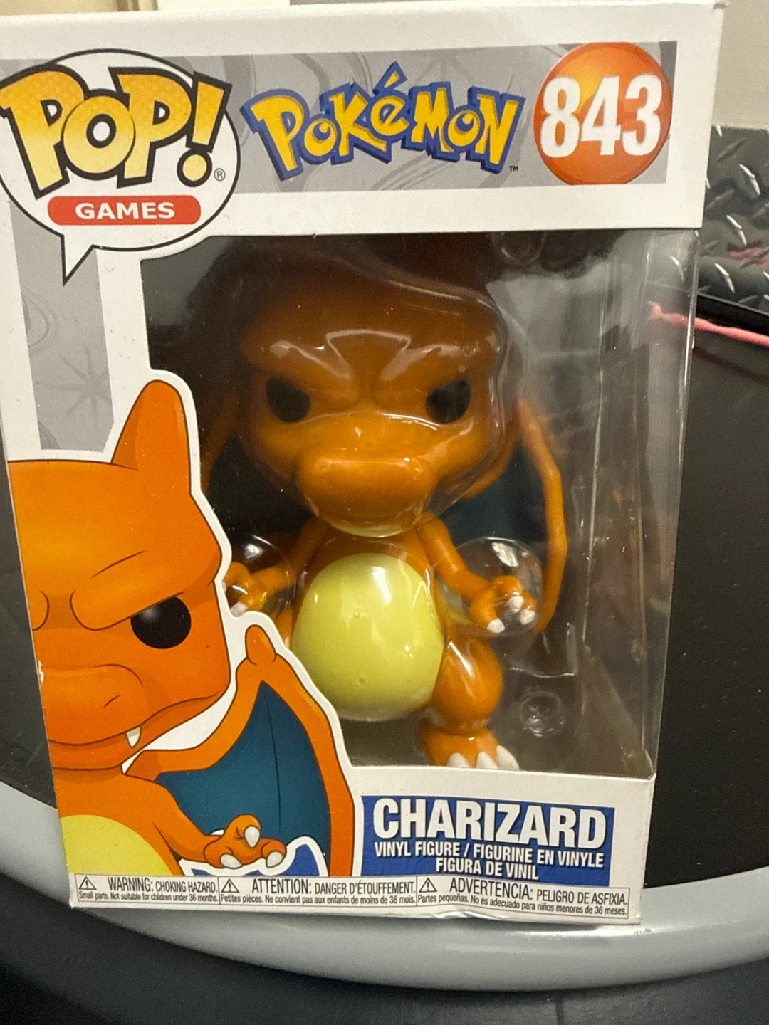 This is a Funko Pop! Games collectible vinyl figure of Charizard, number 843. It comes in its original box. It's made of vinyl.