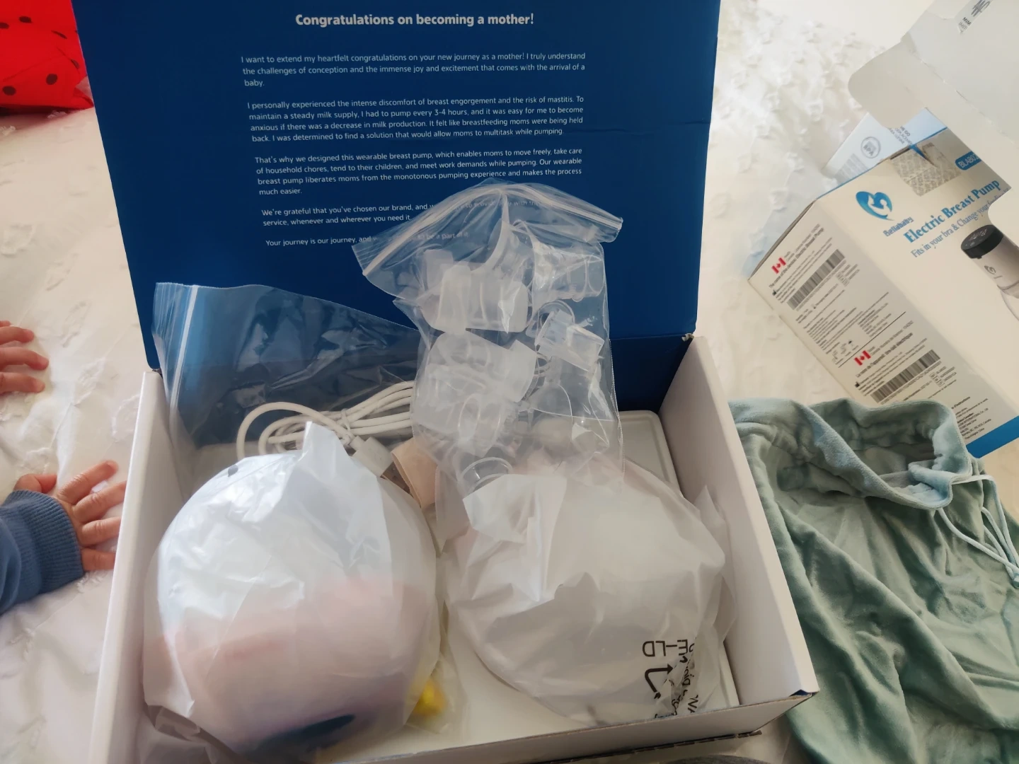 This is a MomMed S21 wearable breast pump. It's designed for discreet and hands-free milk collection. Includes pump parts and charging cable.