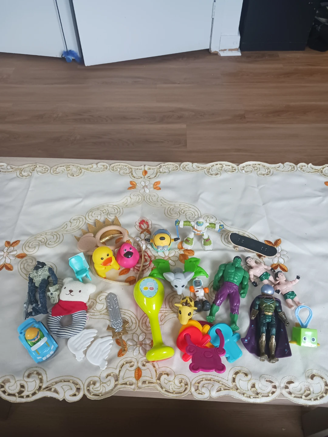 A collection of various small toys, including action figures, animals, and mini vehicles. Items like a skateboard, a plush-like bear, and other assorted play accessories are also included. These are great for imaginative play and building a toy collection!