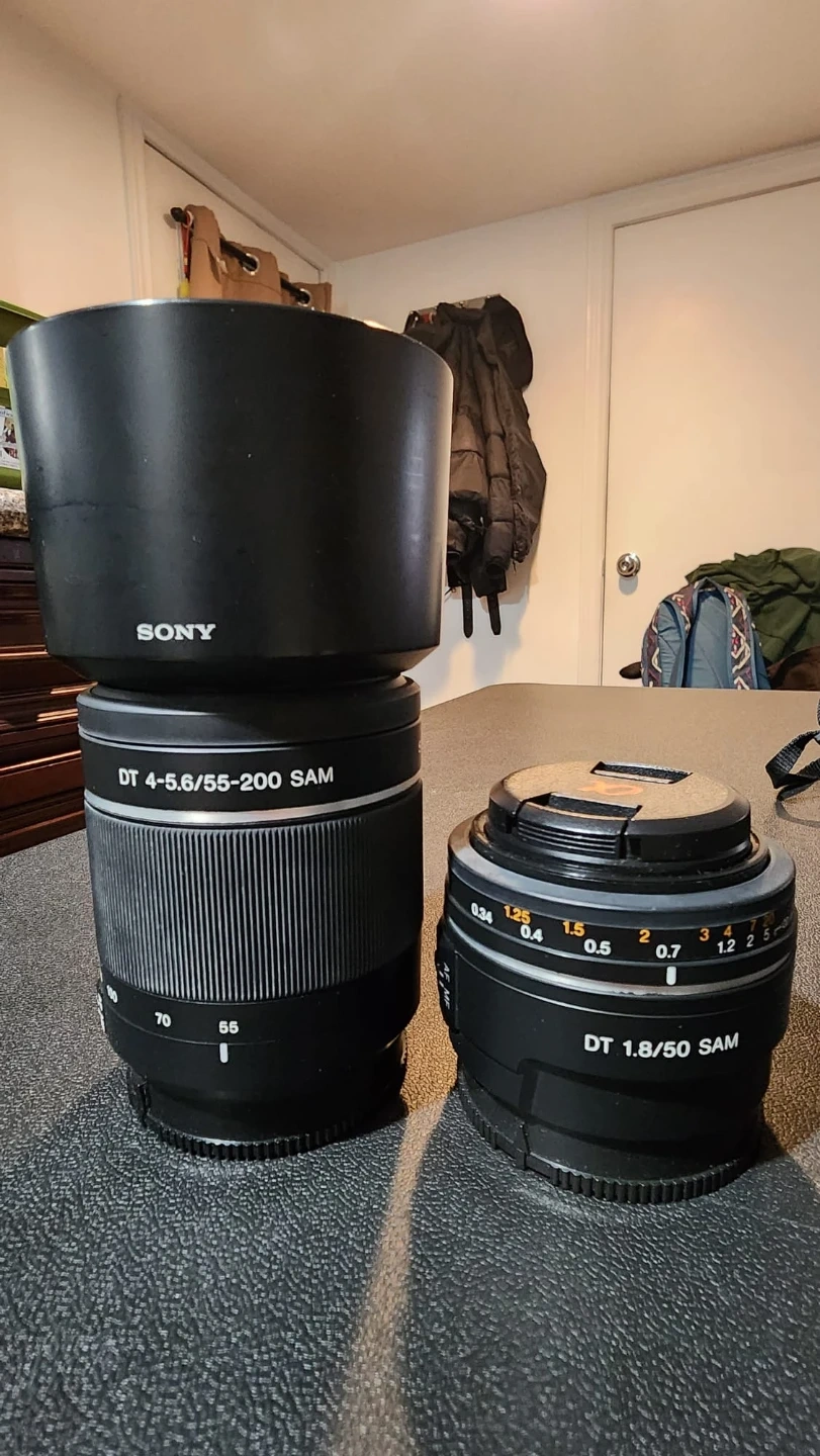 Sony Alpha a58 digital camera with 50mm f/1.8 SAM lens and 18-55mm f/3.5-5.6 SAM lens. Both lenses are in excellent condition. Comes with a lens hood for the 18-55mm lens.