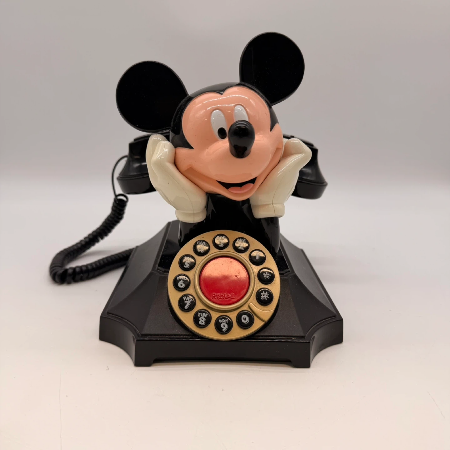 Classic Disney Mickey Mouse desk telephone from the 1990s. Corded landline phone with push-button dial styled like a rotary phone.