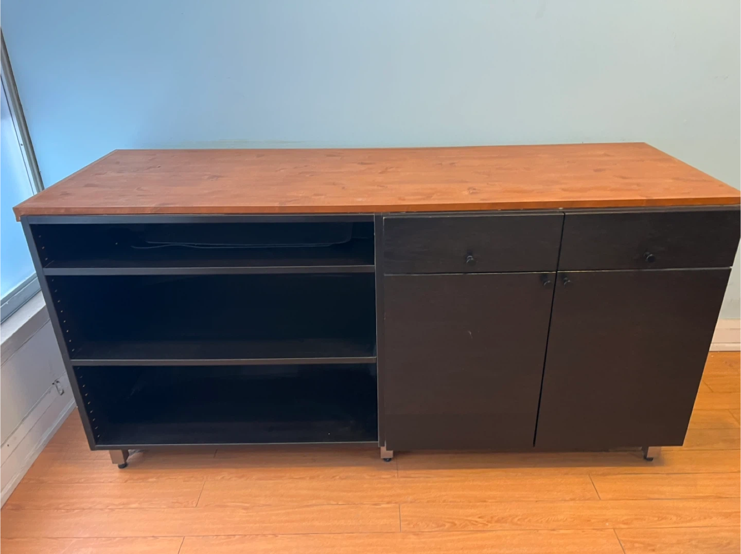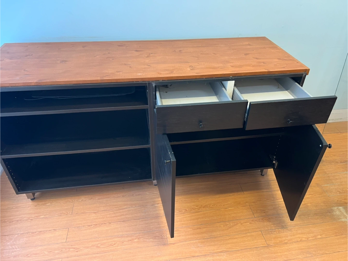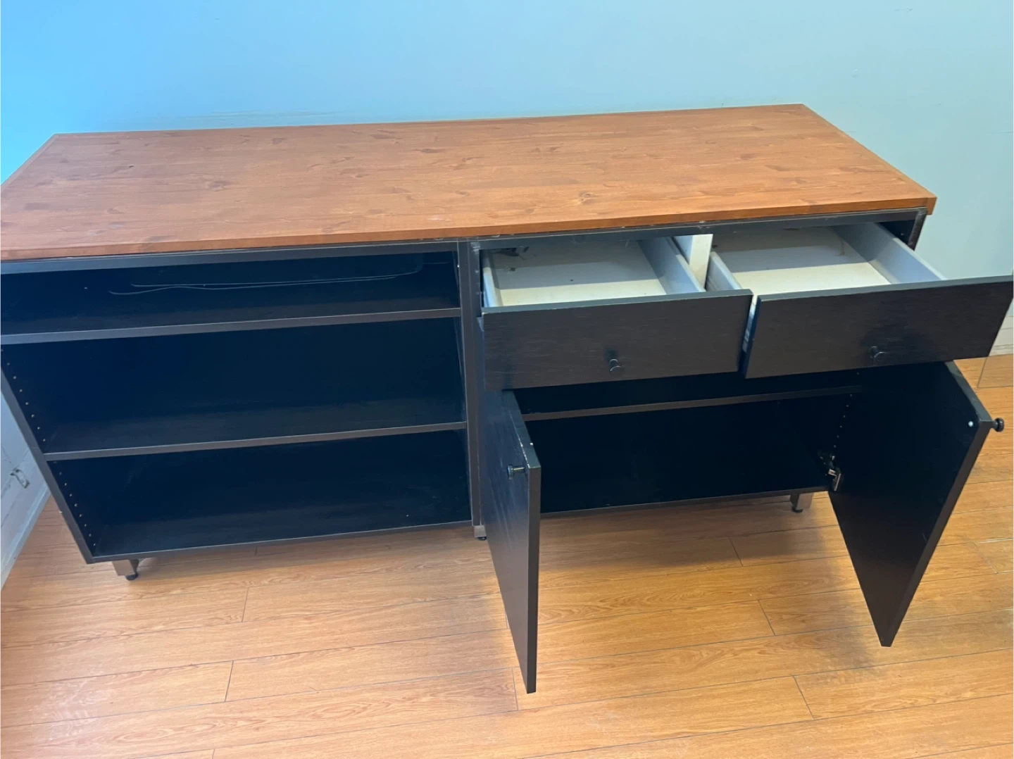 This used cabinet features an open shelving unit on the left with three shelves. On the right, it has two drawers and two cabinet doors. The top surface is a warm wood tone, contrasting with the black frame and doors. It's a versatile piece for media storage or general household organization.