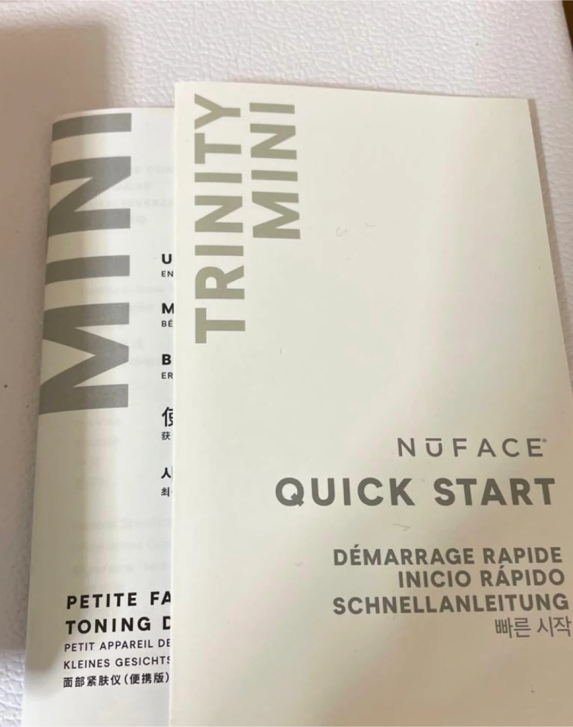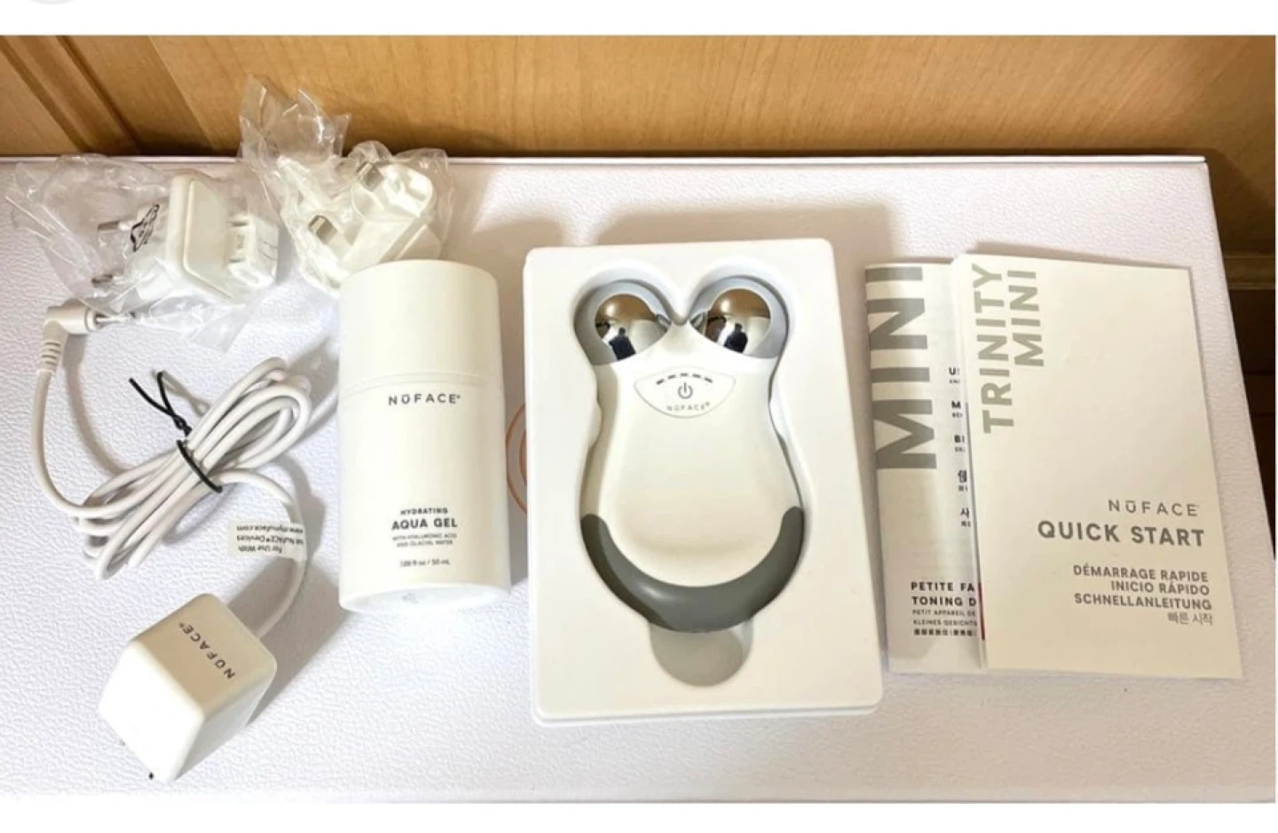 NuFace Trinity Mini device for facial toning. Includes aqua gel and charging accessories. Comes with user manuals and quick start guides.