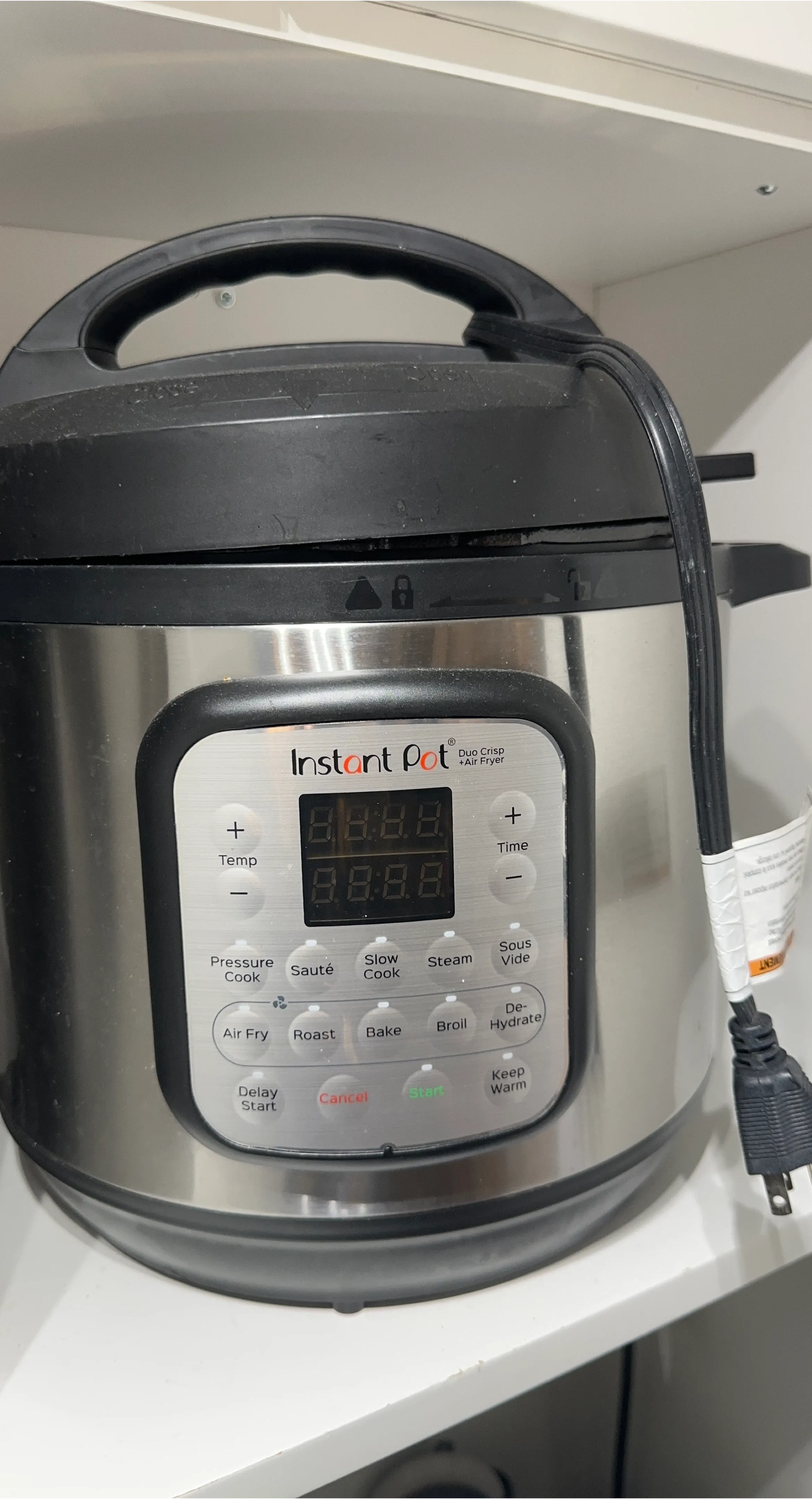 This is an Instant Pot Duo Crisp with Air Fryer functionality. It has multiple cooking settings like pressure cook, sauté, slow cook, steam, sous vide, air fry, roast, bake, broil, and dehydrate. It's a versatile kitchen appliance for various cooking needs.