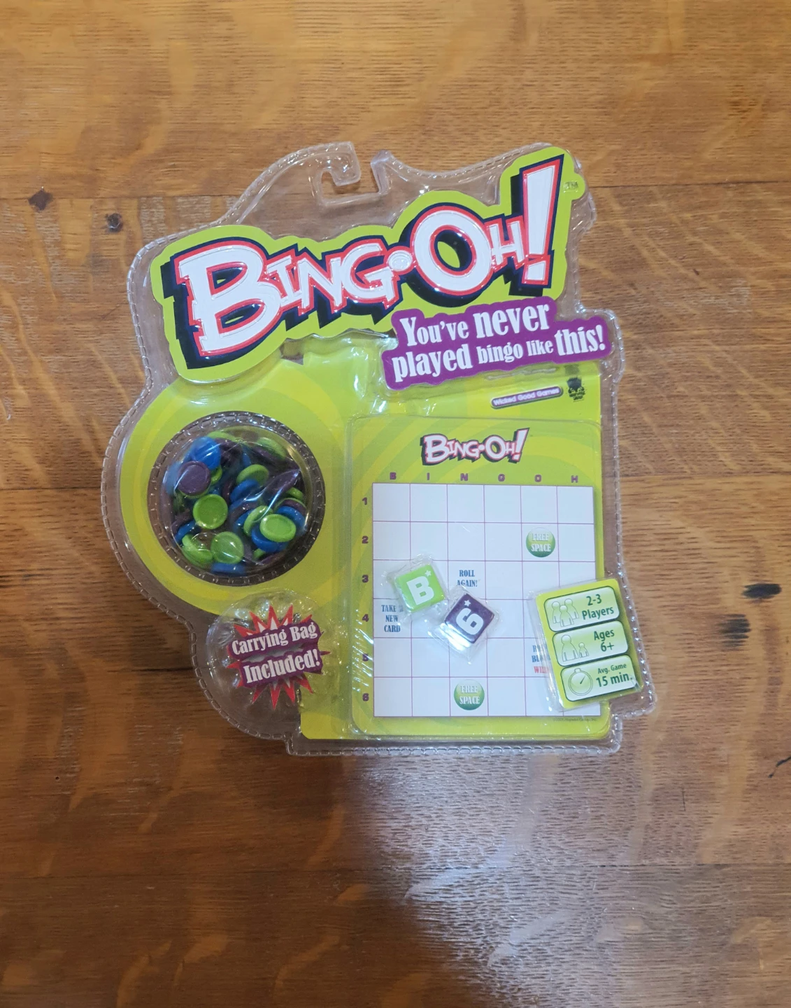 Selling a new Bingo-Oh! board game, still sealed in its original packaging! It's perfect for 2-3 players and each game lasts about 15 minutes. The set includes 20 Bingo-Oh! cards, 121 Bingo-Oh! chips, and a carrying bag. Get ready for some bingo madness!