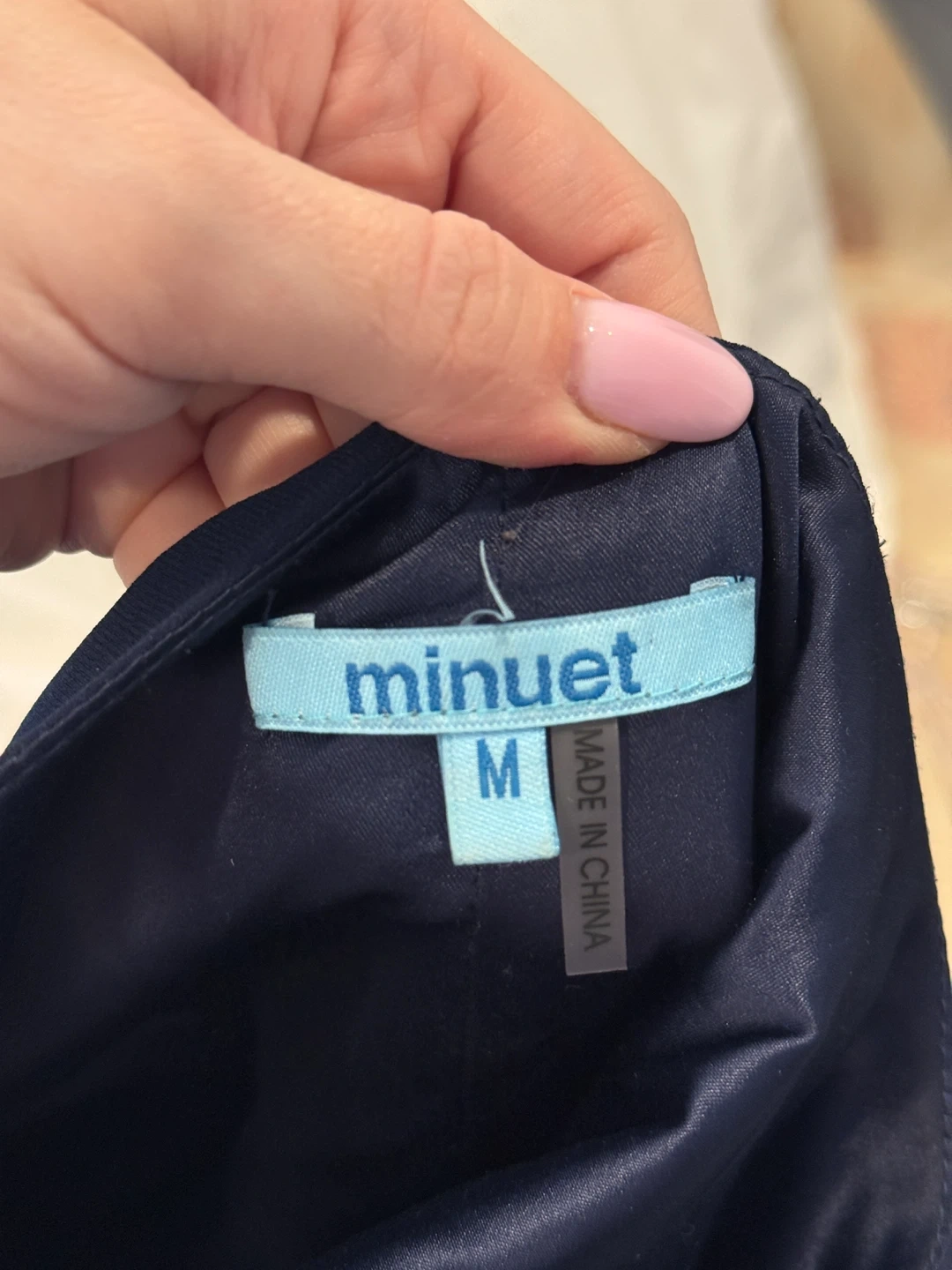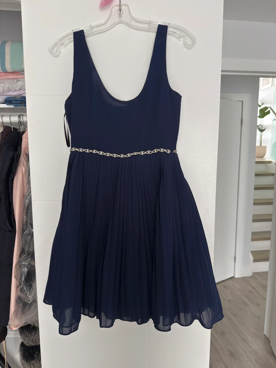 This is a navy blue Minuet dress. It's a size medium. The dress features a pleated skirt and a decorative waistband.