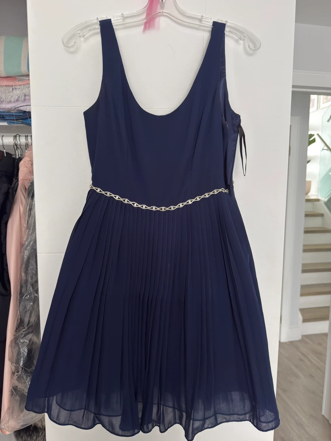 This is a navy blue Minuet dress. It's a size medium. The dress features a pleated skirt and a decorative waistband.
