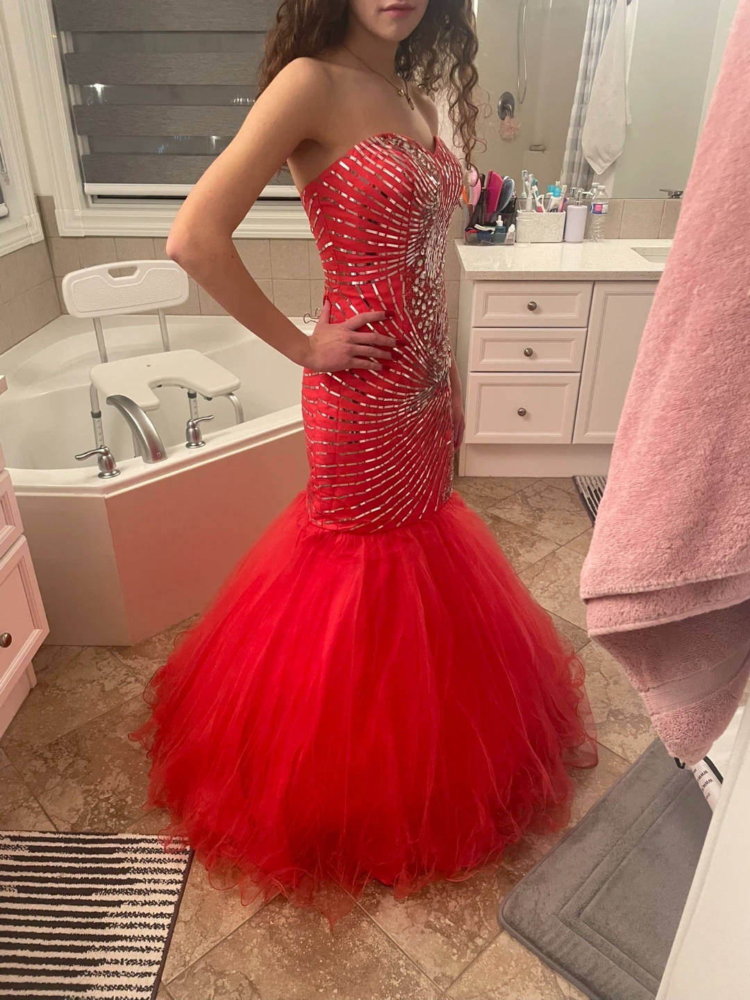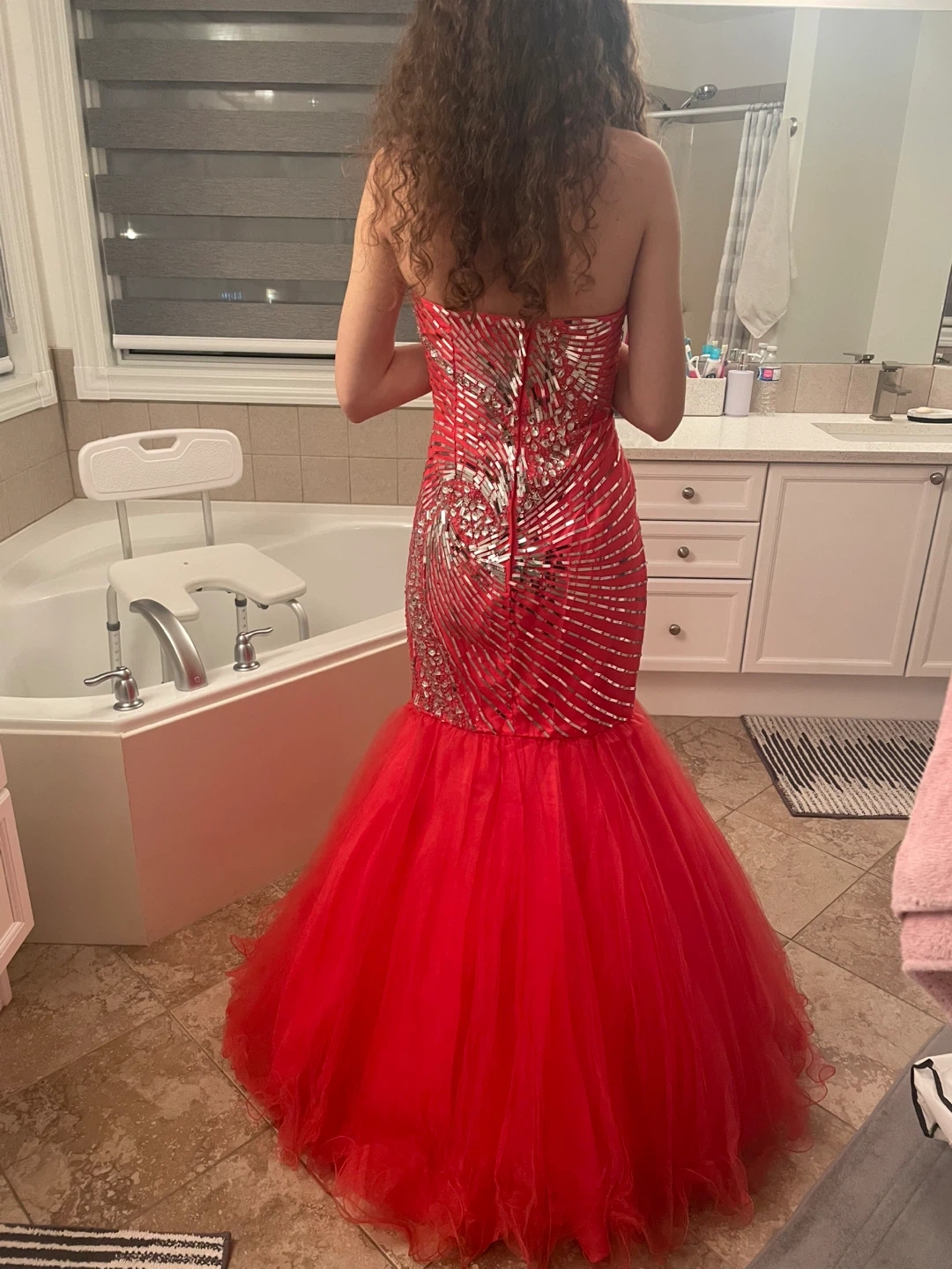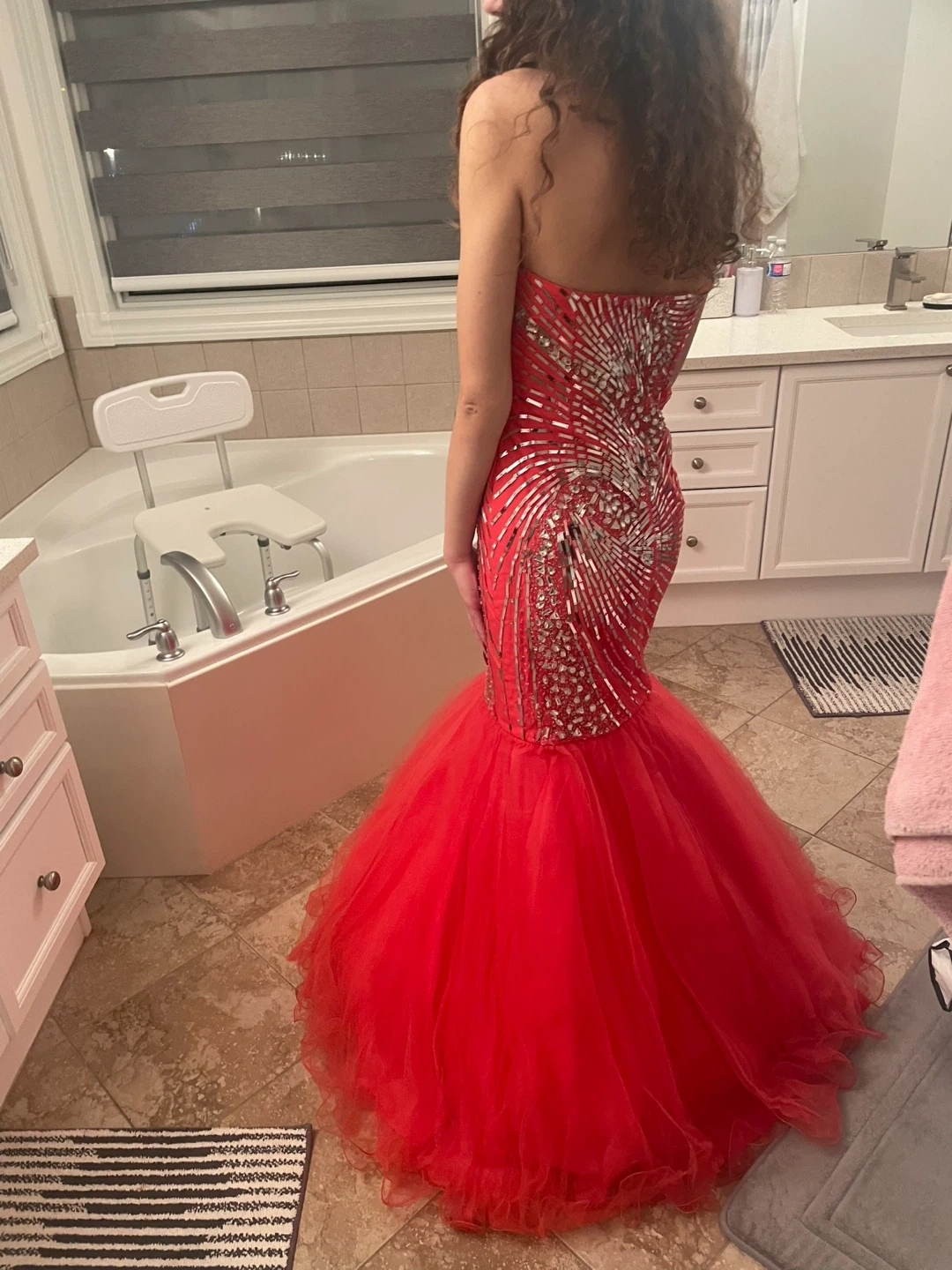Beautiful orange strapless mermaid style prom dress. It has silver detailing on the bodice and a full tulle skirt. Perfect for a special occasion!