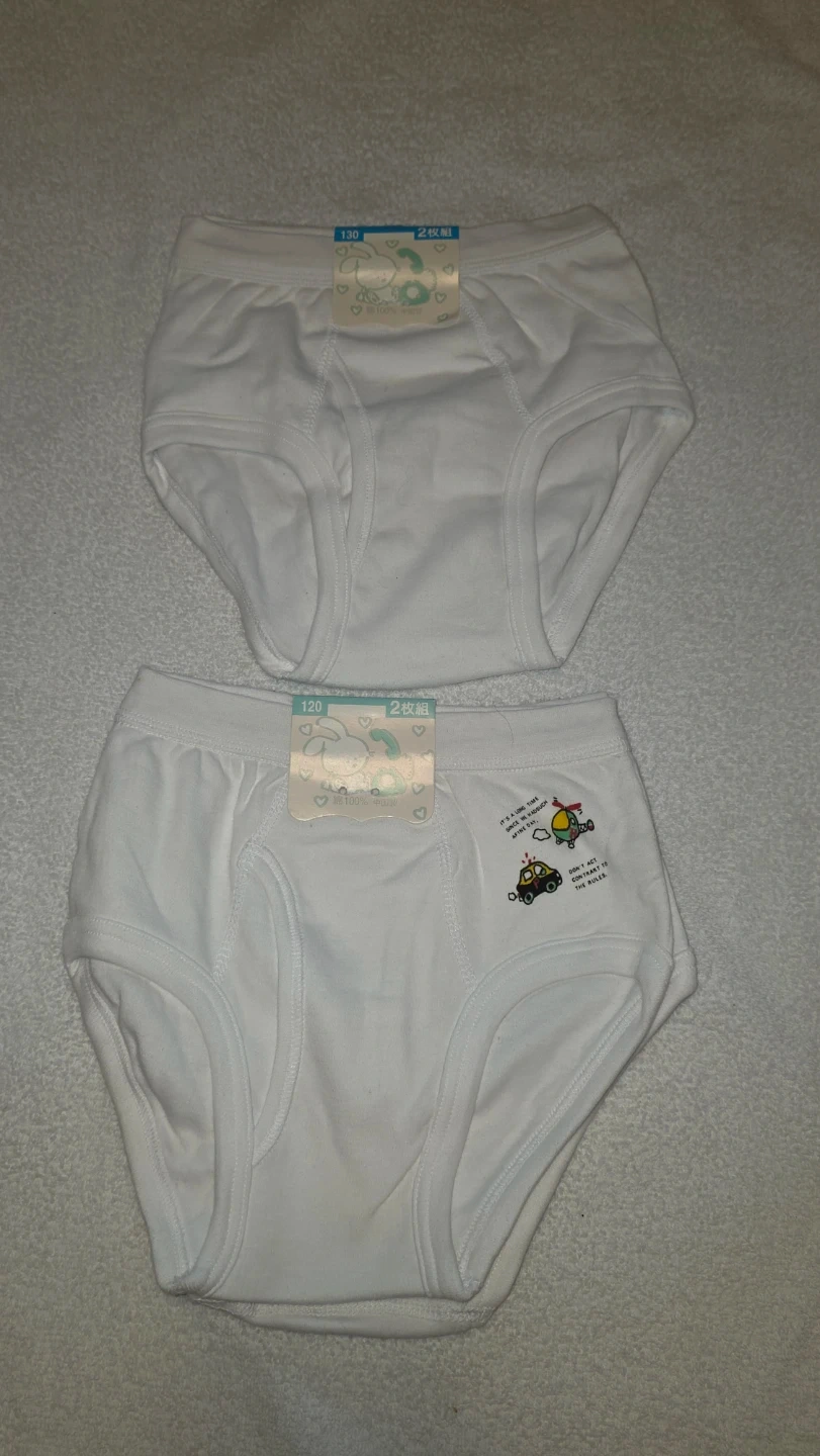 This is a 2-pack of white cotton underwear for kids. Both pairs are size 120 and 130 respectively. (Total 4 pcs) They're made of 100% cotton for comfort. One pair has a car and helicopter graphic, the other has a playful robot design.
