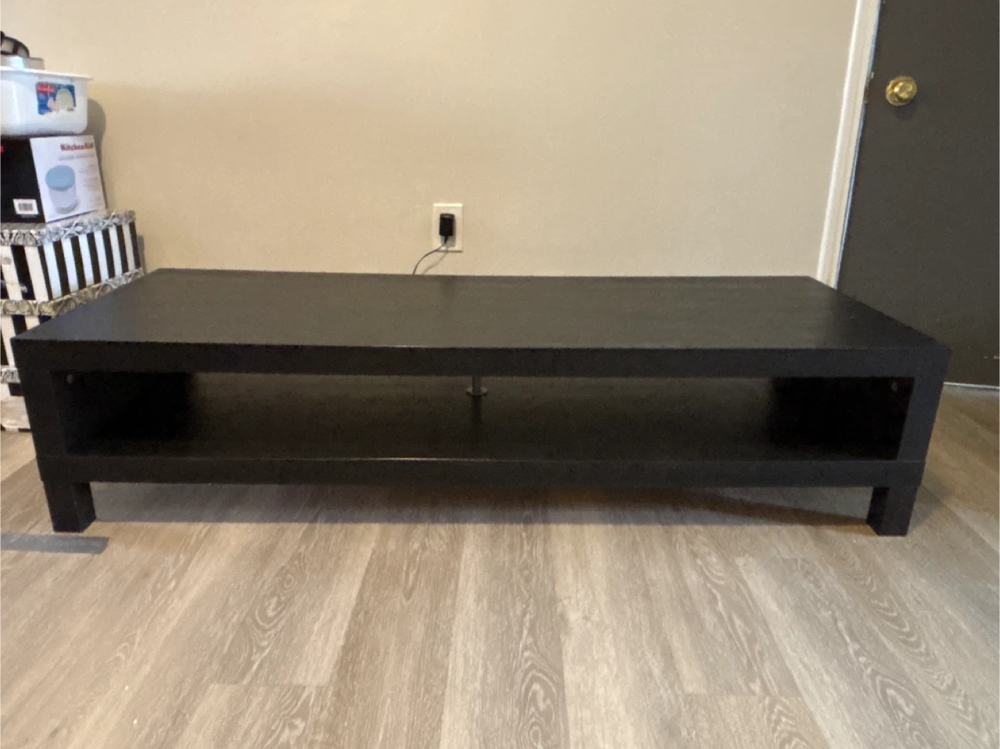 A simple black TV stand with an open shelf. It's made of wood and is perfect for holding your TV and media consoles. This stand is great for a living room or bedroom setup. From a non smoking house.