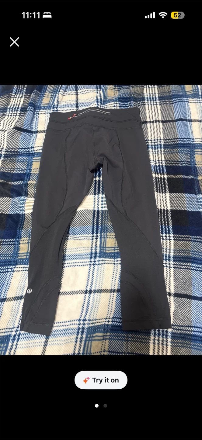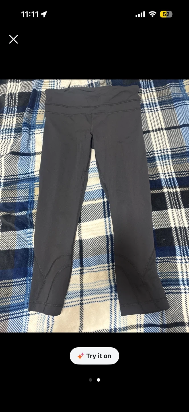 Lululemon cropped leggings in a dark grey colour. These are great for workouts or casual wear. The material is comfortable and durable. Size 4 pick up cash only