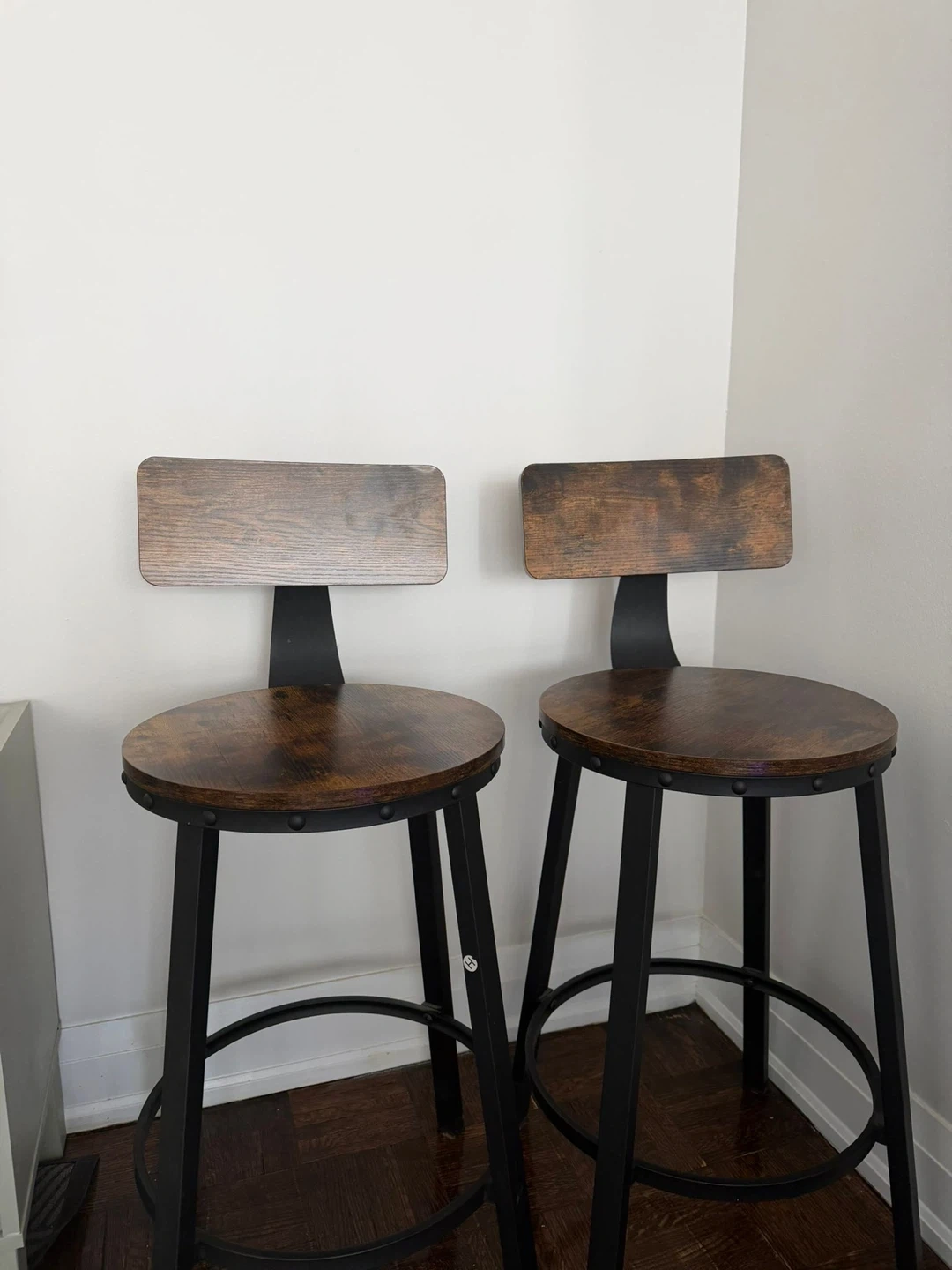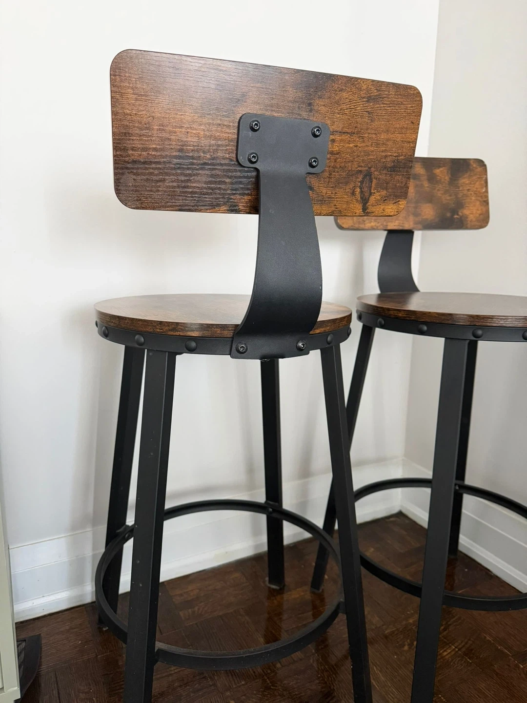 These industrial-style bar stools feature a rustic wood seat and backrest with a sturdy black metal backrest.
