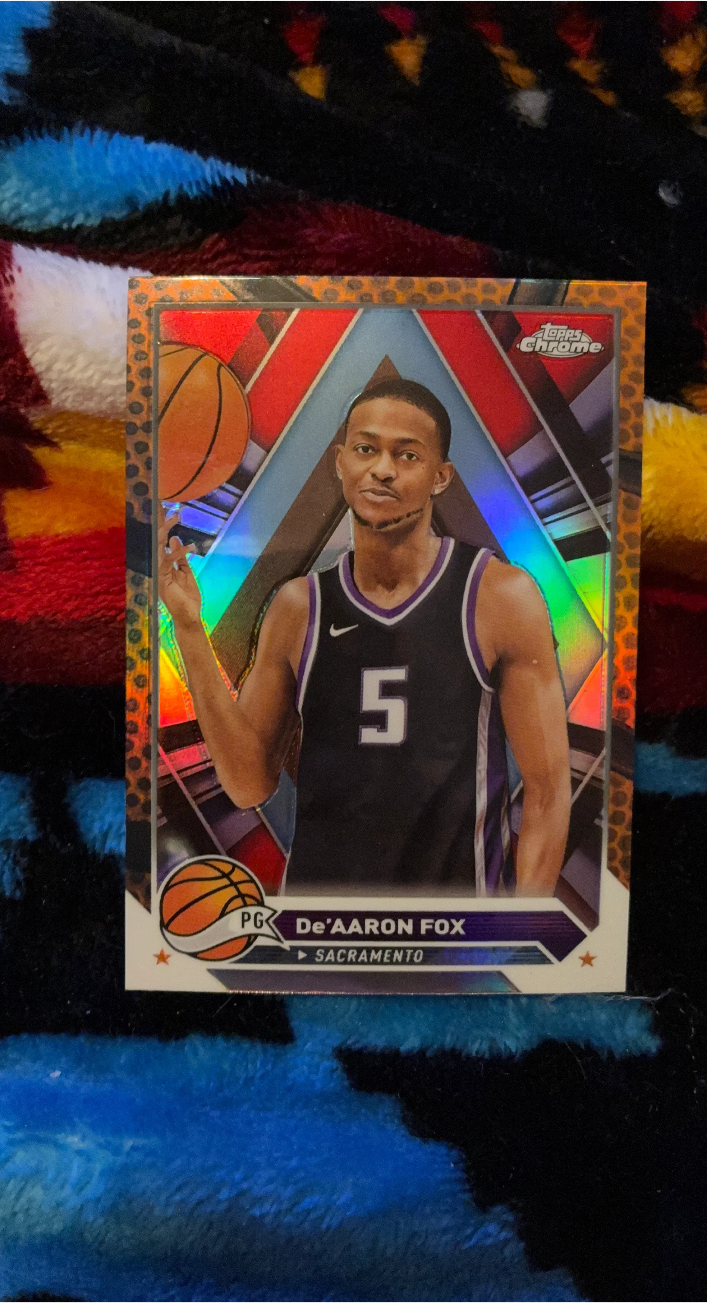 This is a Topps Chrome basketball trading card featuring De'Aaron Fox of the Sacramento Kings. It's a collector's item for basketball fans. Card is in excellent condition.