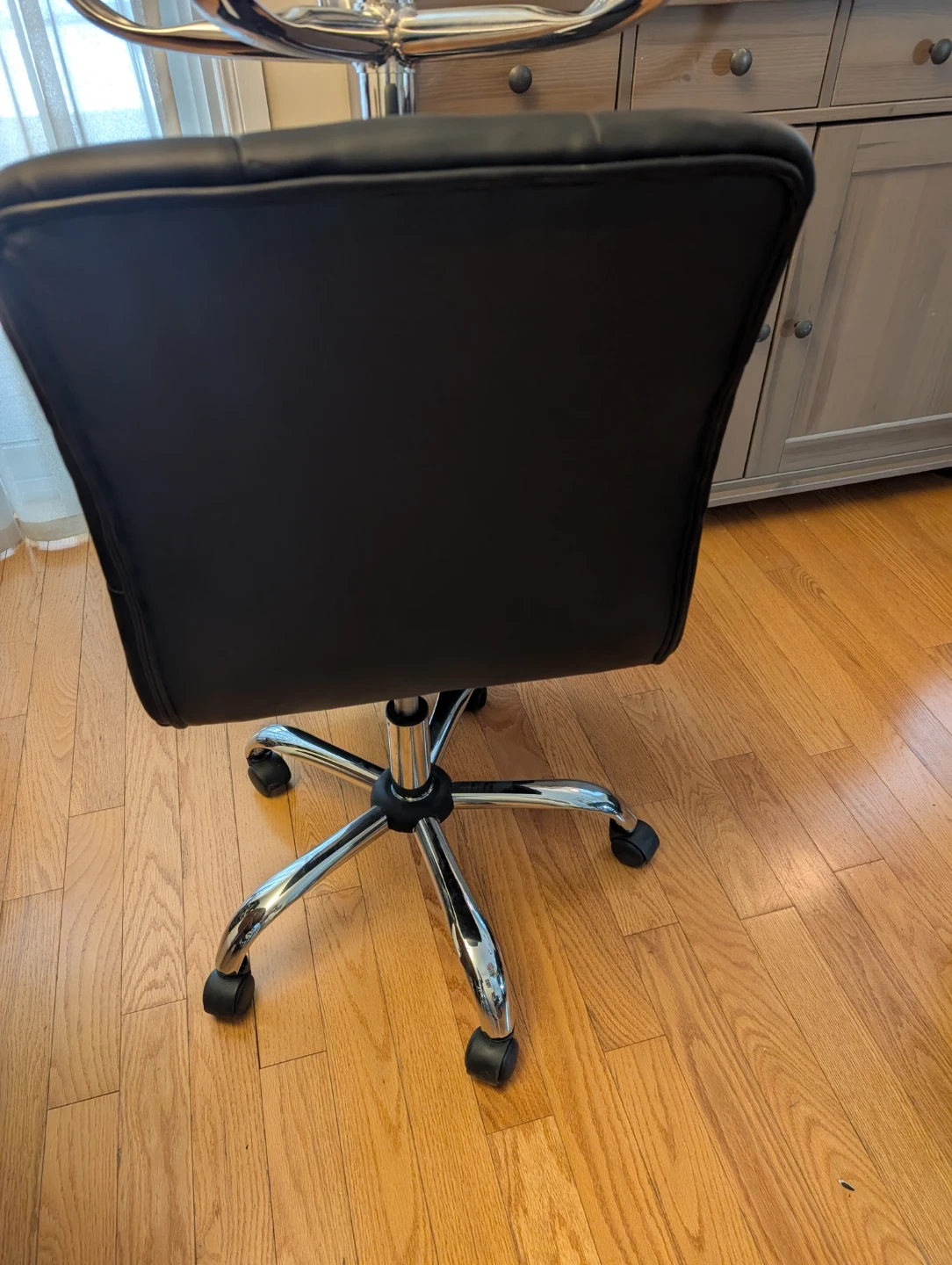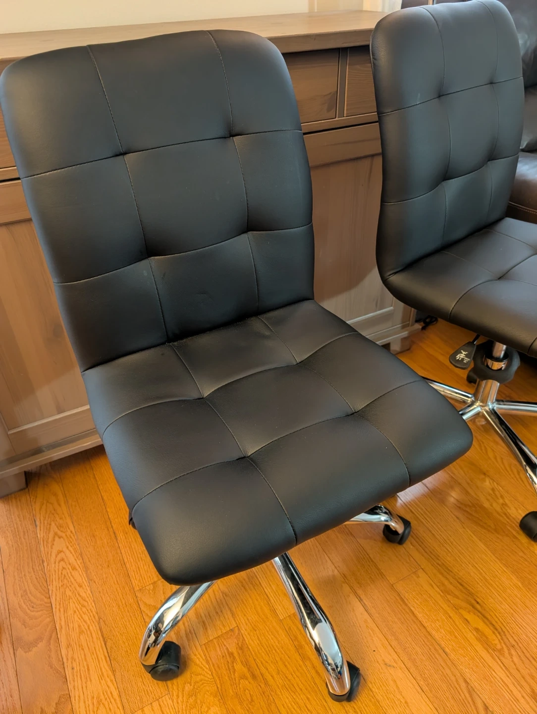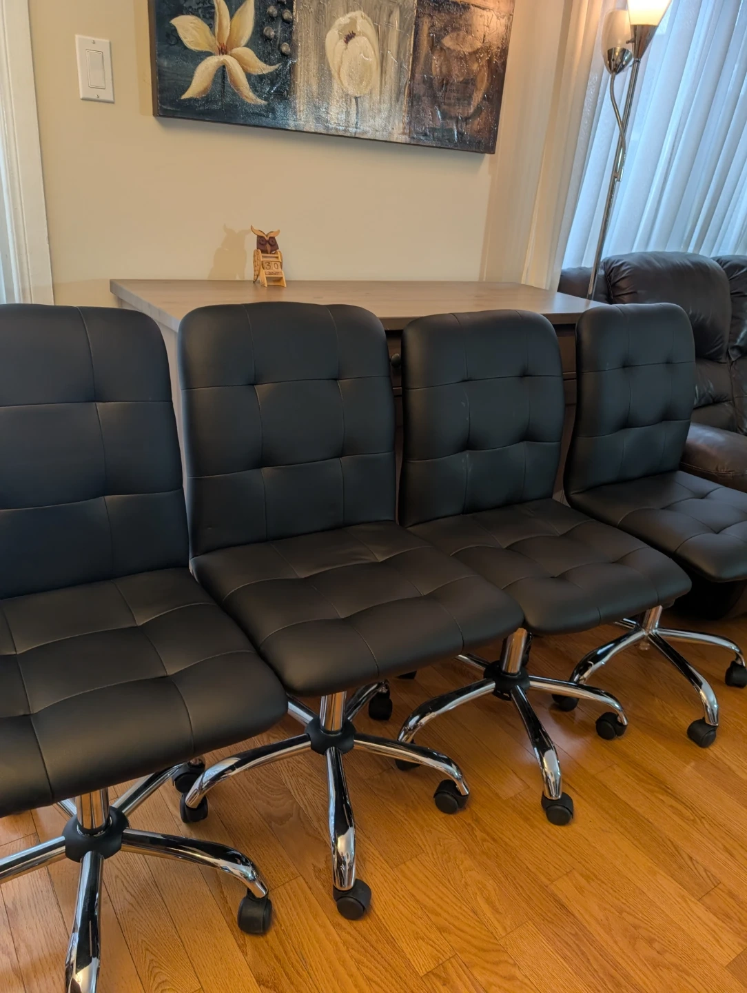 Four black office chairs with tufted upholstery and chrome base. They're equipped with wheels for easy mobility. These chairs are suitable for home or office use.