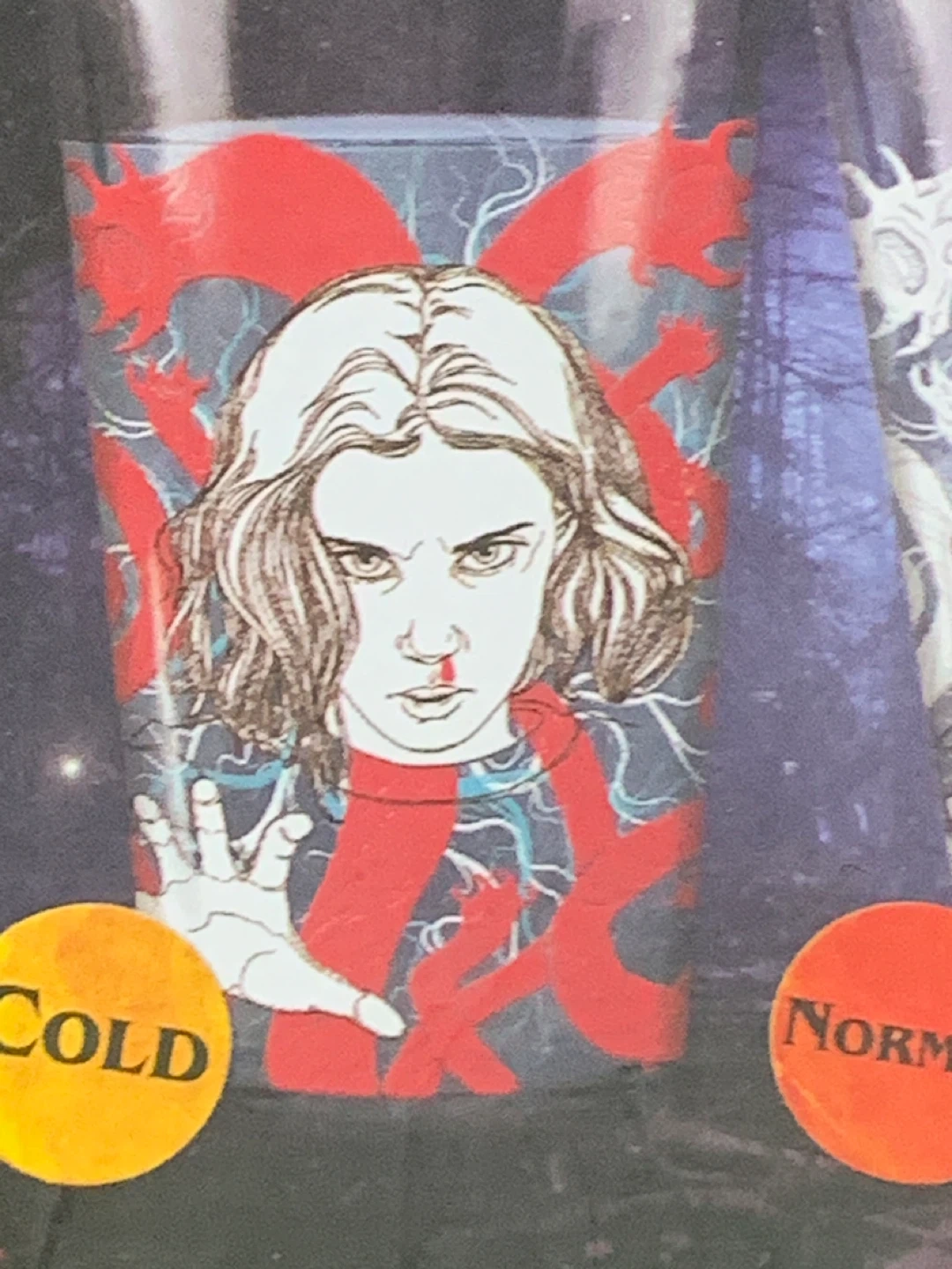 The design, featuring the character Eleven in front of entangled vines from the Upside Down, changes from a black and white design to a blood red color when a very cold drink is added.