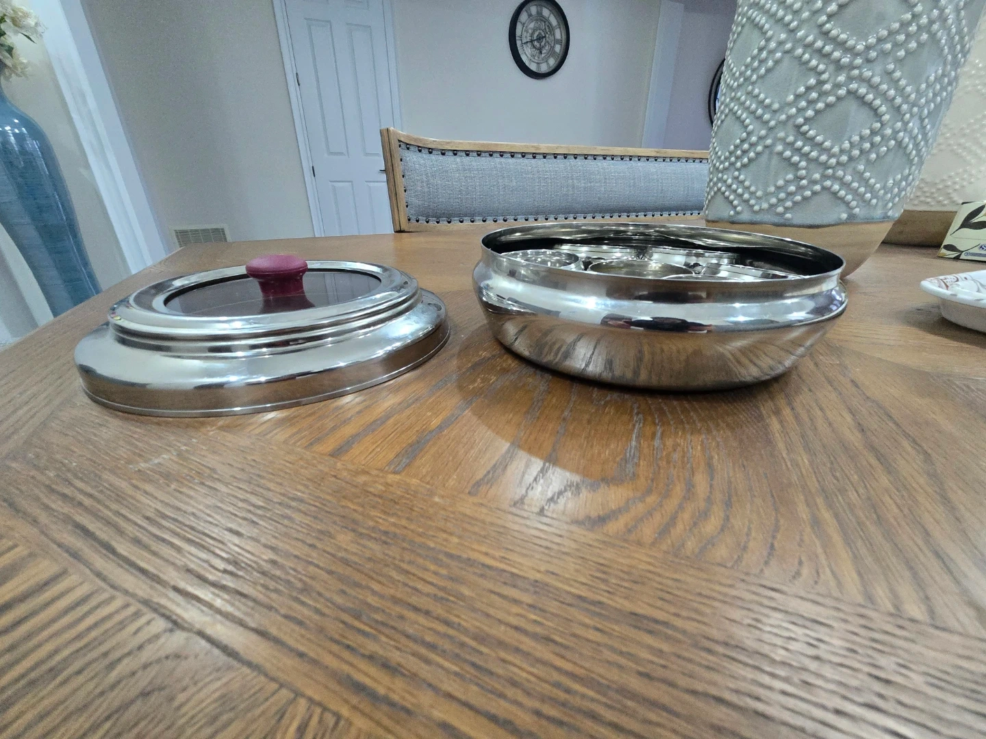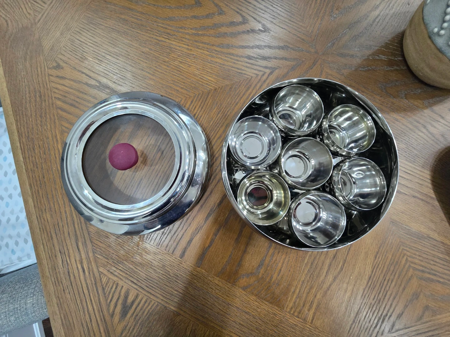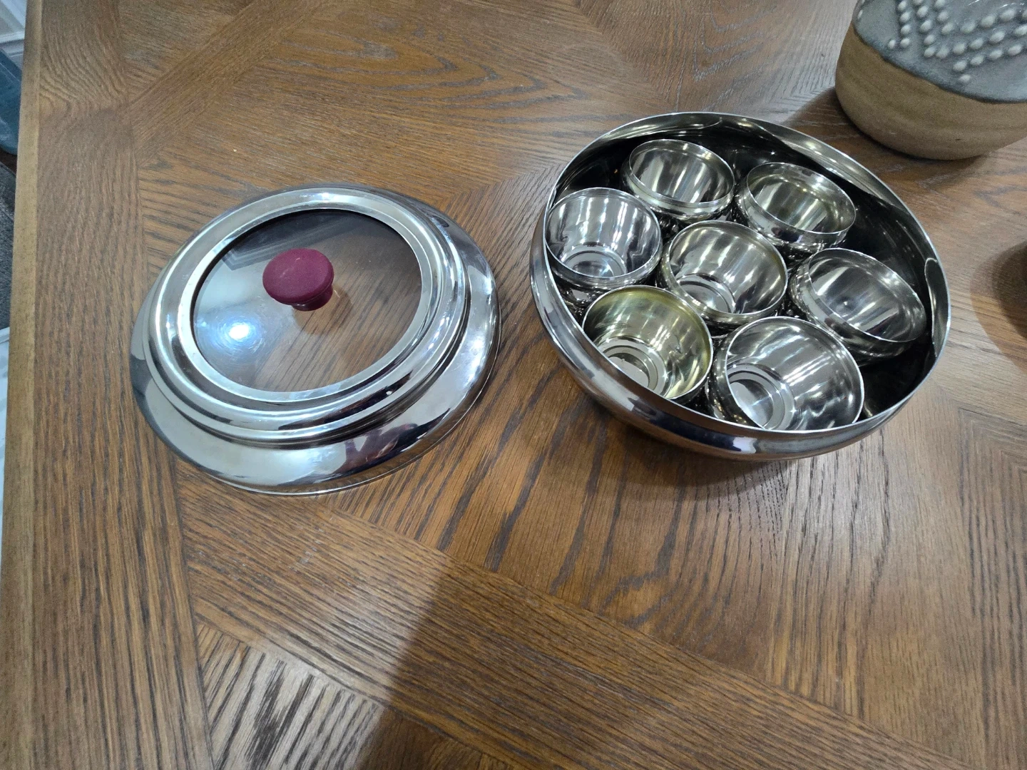This stainless steel masala dabba spice box comes with seven small bowls and a lid. It's perfect for organizing and storing your favourite spices. The durable stainless steel construction ensures long-lasting use.