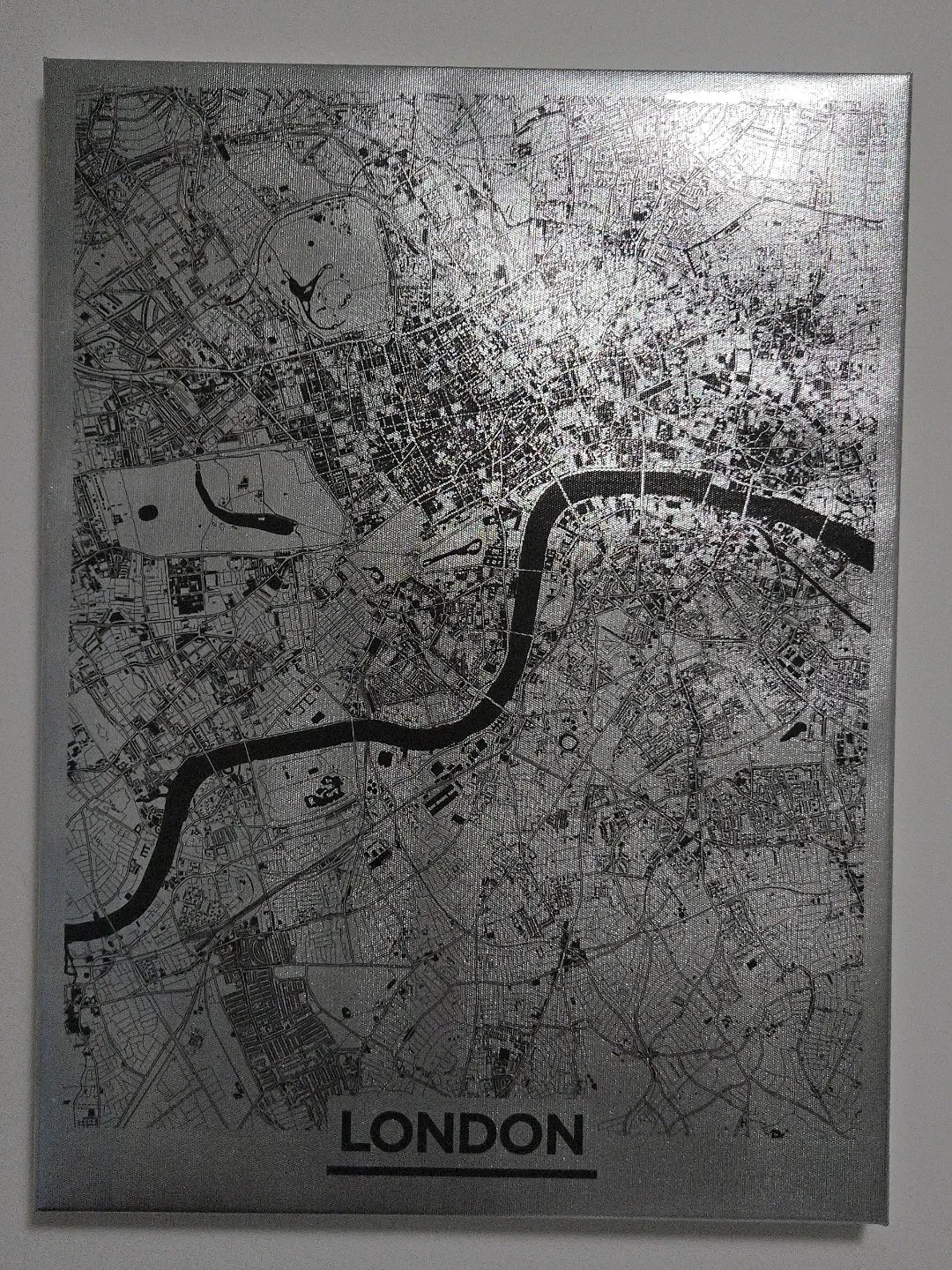 Grey metallic canvas art featuring a detailed map of London. It's a unique piece for home decor.
