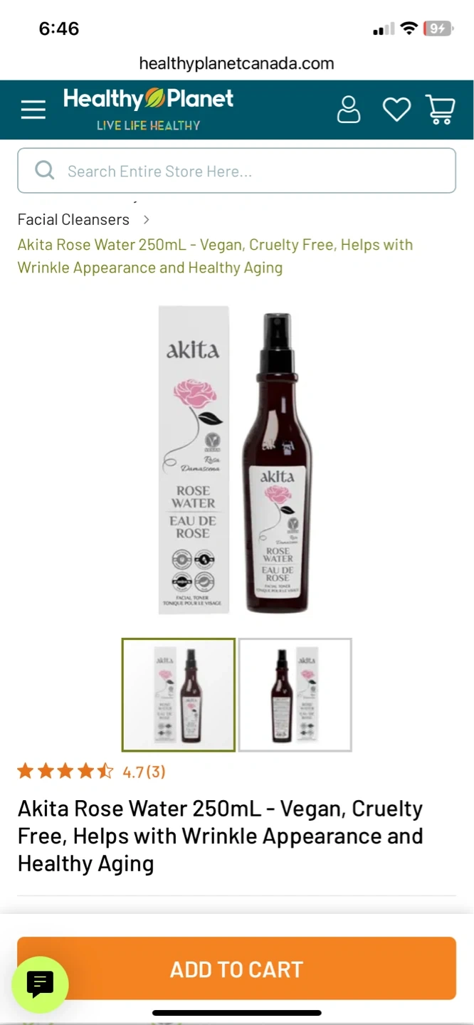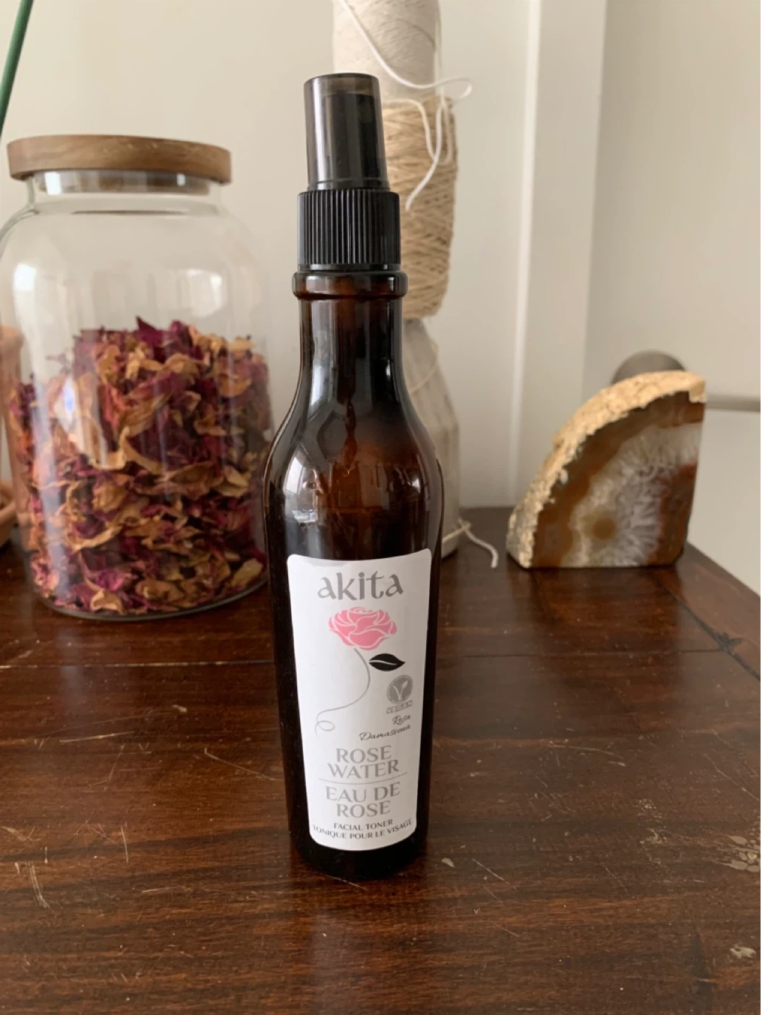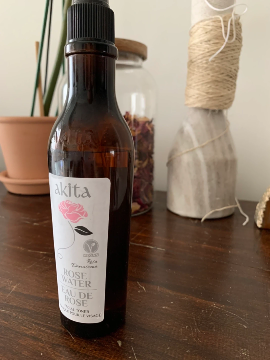 This Akita Rose Water is a facial toner. It comes in a spray bottle for easy application. It's a vegan product, great for refreshing your skin! Not used, new without the box.