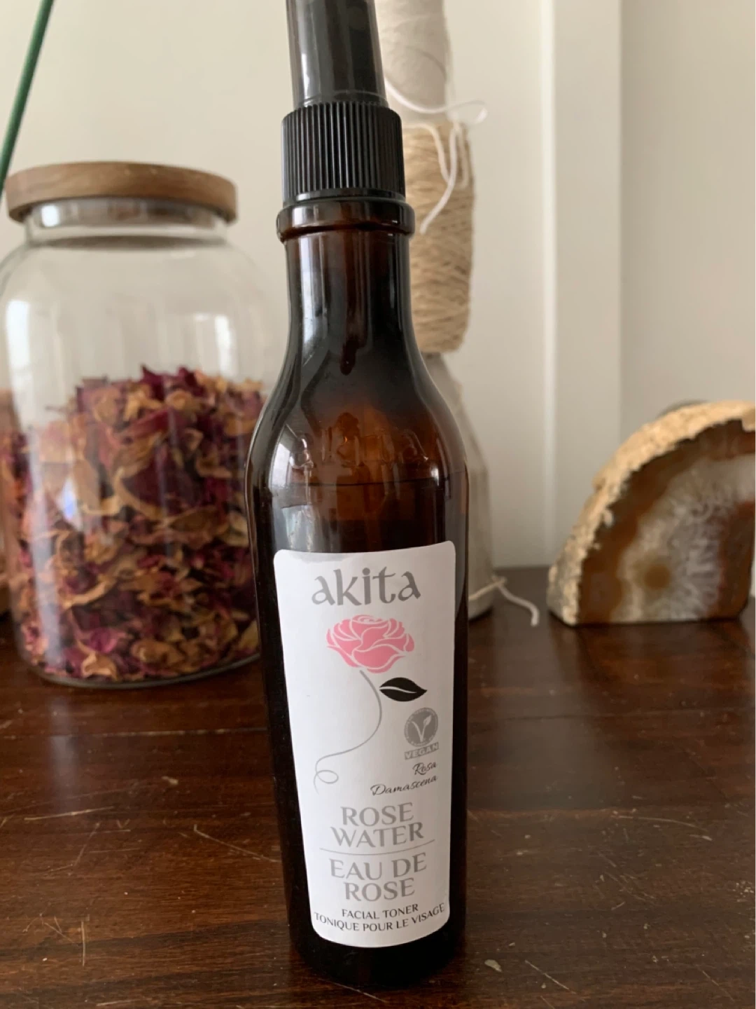 This Akita Rose Water is a facial toner. It comes in a spray bottle for easy application. It's a vegan product, great for refreshing your skin! Not used, new without the box.