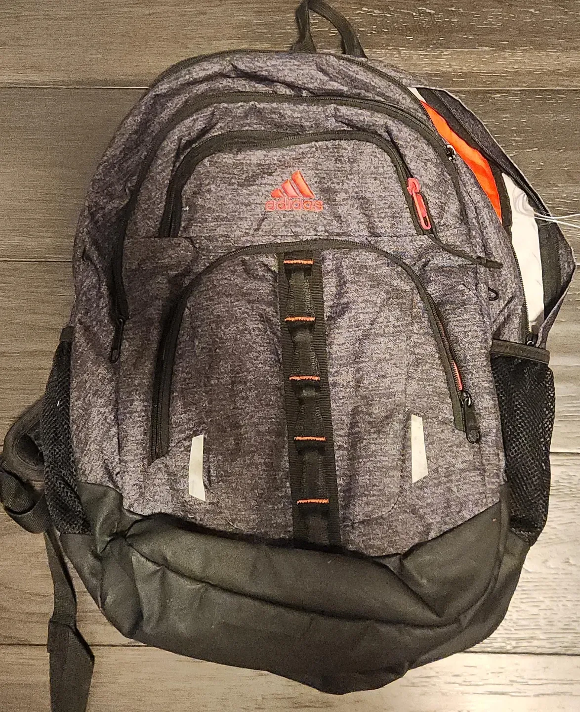 Adidas backpack in a grey and black heathered pattern. It's got multiple zippered compartments and side mesh pockets. Great for everyday use or school!