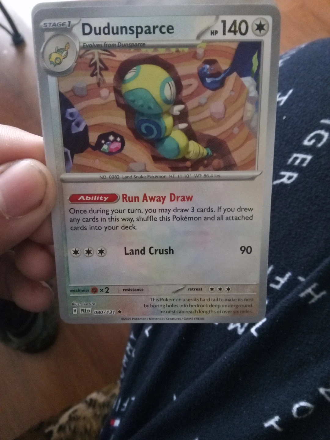 This is a Stage 1 Dudunsparce trading card, number 080/131. It features the ability 'Run Away Draw' and the attack 'Land Crush' for 90 damage. The card has a weakness of x2 and resistance. Its HP is 140.