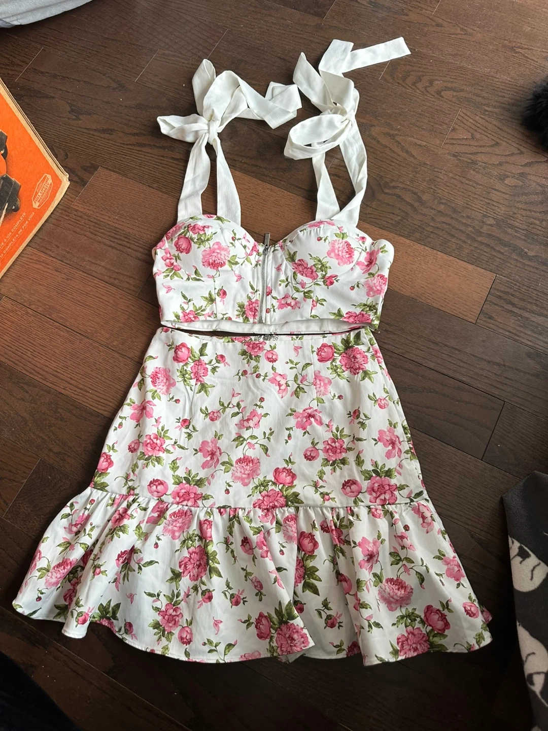 White floral print two-piece set with pink roses. Features a zipper closure on the top and skirt. Adorable ruffled hem on the skirt!