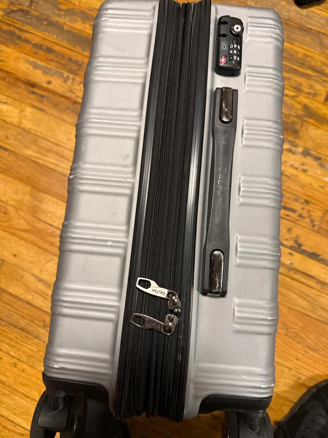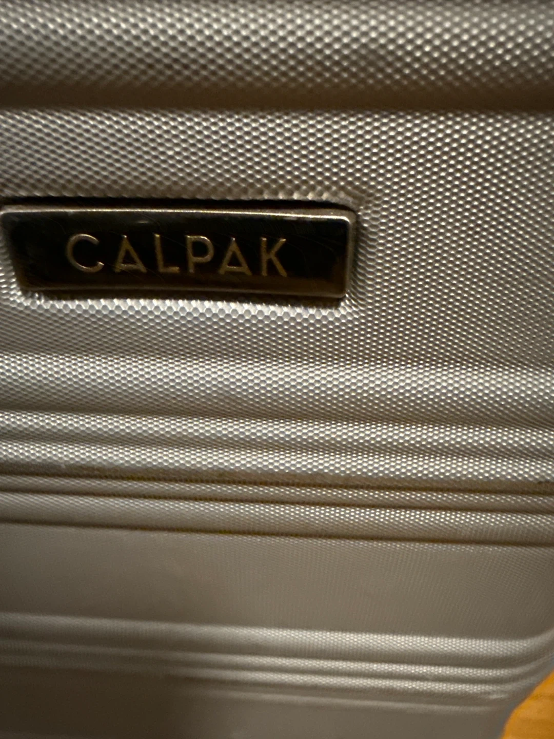 This CALPAK carry-on suitcase is silver with a hardside exterior. It features a telescoping handle and spinner wheels for easy maneuverability. The interior has multiple compartments for organized packing. It's perfect for short trips and weekend getaways!