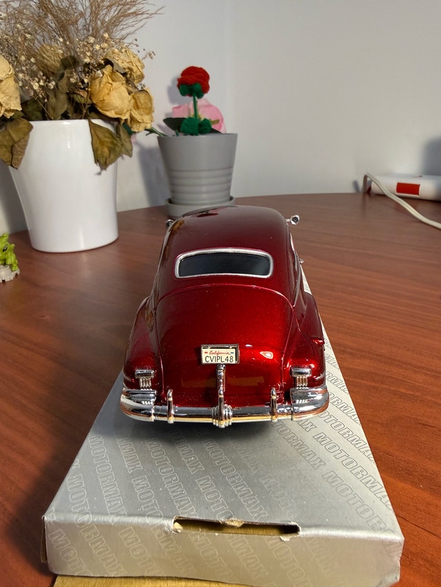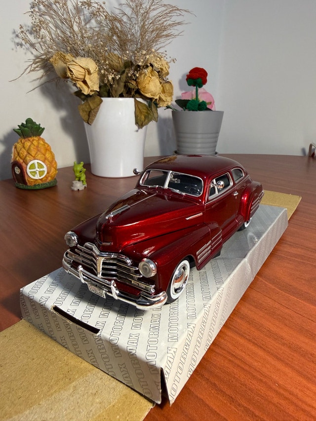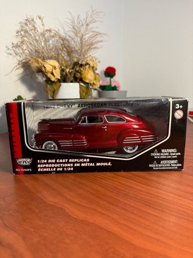 Beautiful 1:24 scale diecast model of the 1948 Chevrolet Fleetline by Motor Max. Finished in a stunning deep metallic red with chrome detailing, this model captures the classic curves of the original car perfectly. Features: • Opening hood, doors, and trunk • Detailed interior and engine bay • Chrome bumpers and trim • Whitewall tires • High-quality diecast metal body • Comes with original box. Excellent condition. Displayed only. No major scratches or damage. Box included. Perfect for collectors, classic car enthusiasts, or display decor. Pickup near Mavis & Eglinton, Mississauga. Message me if you have any questions!