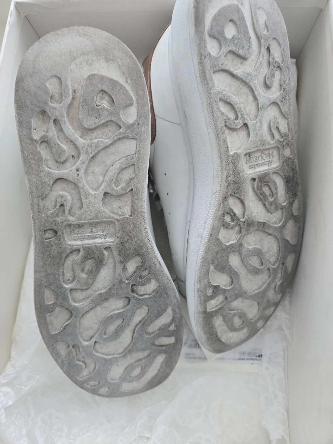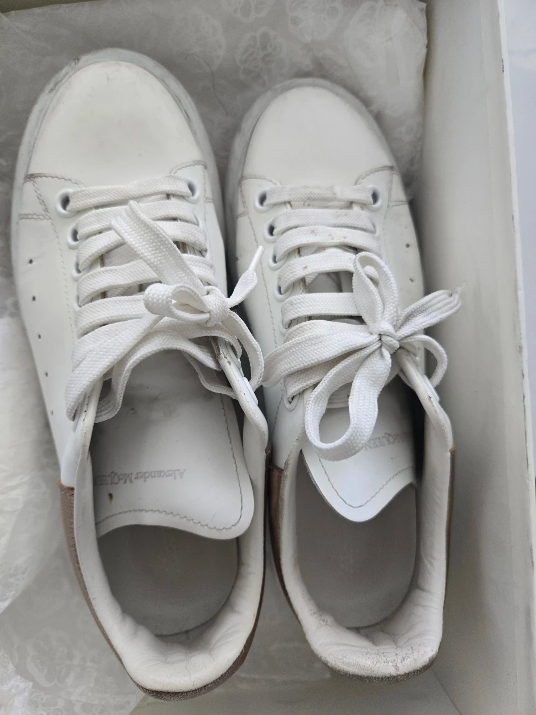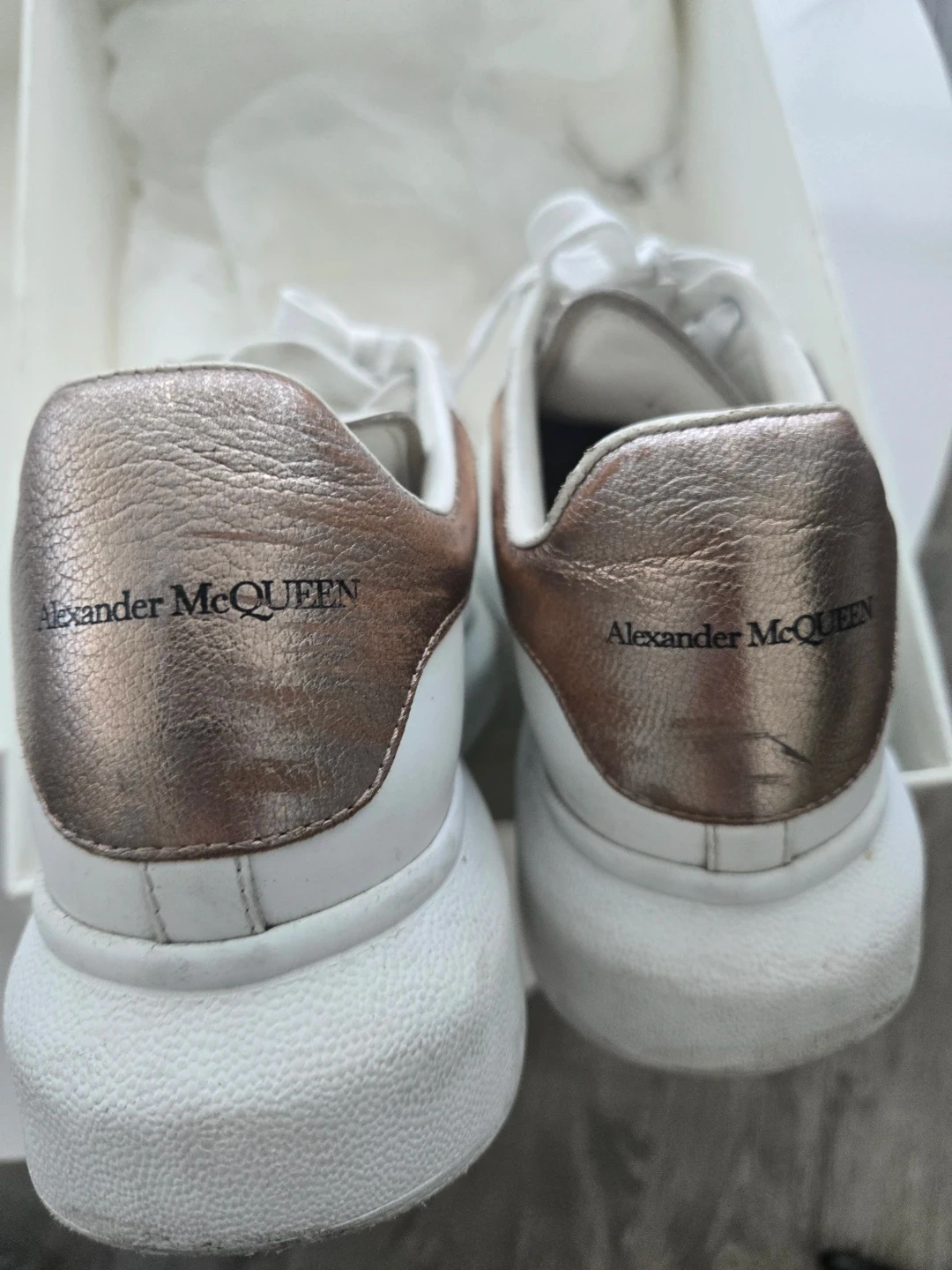 Authentic leather Alexander McQueen sneakers with rose gold accents. Includes original box. These sneakers have been worn but still have lots of life left in them!