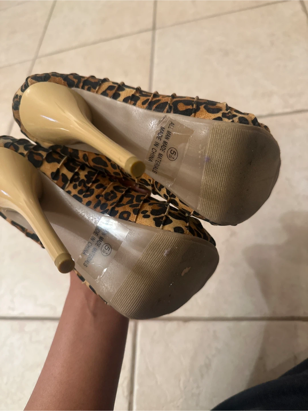 Liliana peep-toe heels with a leopard print. They feature a stiletto heel and studded detailing. Made with synthetic materials.