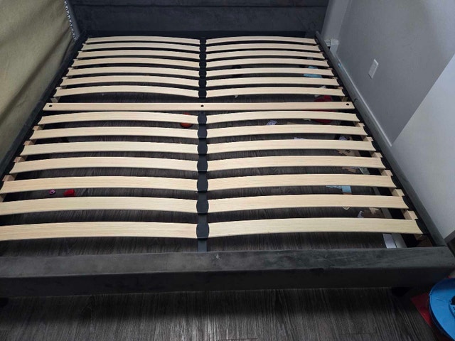 This king bed frame features a stylish and modern design with a button-tufted headboard. The frame is in used condition, but it is still sturdy and supportive. Perfect for adding a touch of elegance to your bedroom.