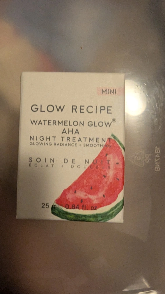 Selling a mini Glow Recipe Watermelon Glow AHA night treatment! This treatment is designed to provide glowing radiance and smoothing while you sleep. It comes in a 25 ml (0.84 fl oz) size, perfect for trying it out or for travel