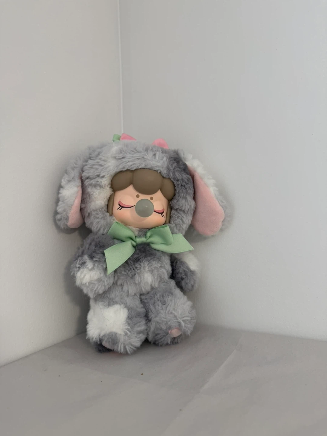 Cute plush doll wearing a grey bunny costume with pink accents. It features a large green bow at the neck and pink inner ears. This toy is soft and huggable!