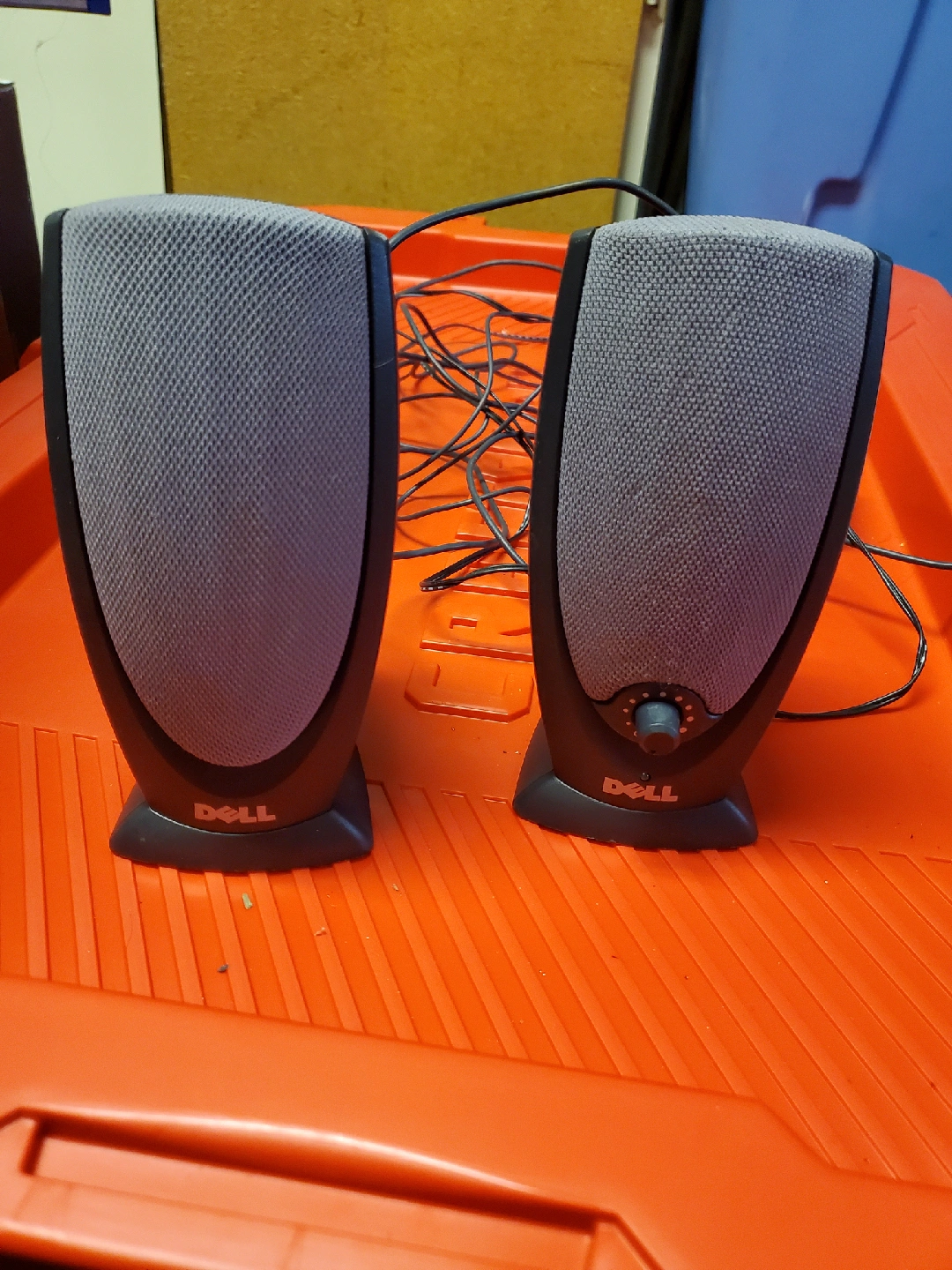 Selling a set of Dell speakers. They are black and grey. They have a volume control knob on the front. Includes speaker cables.