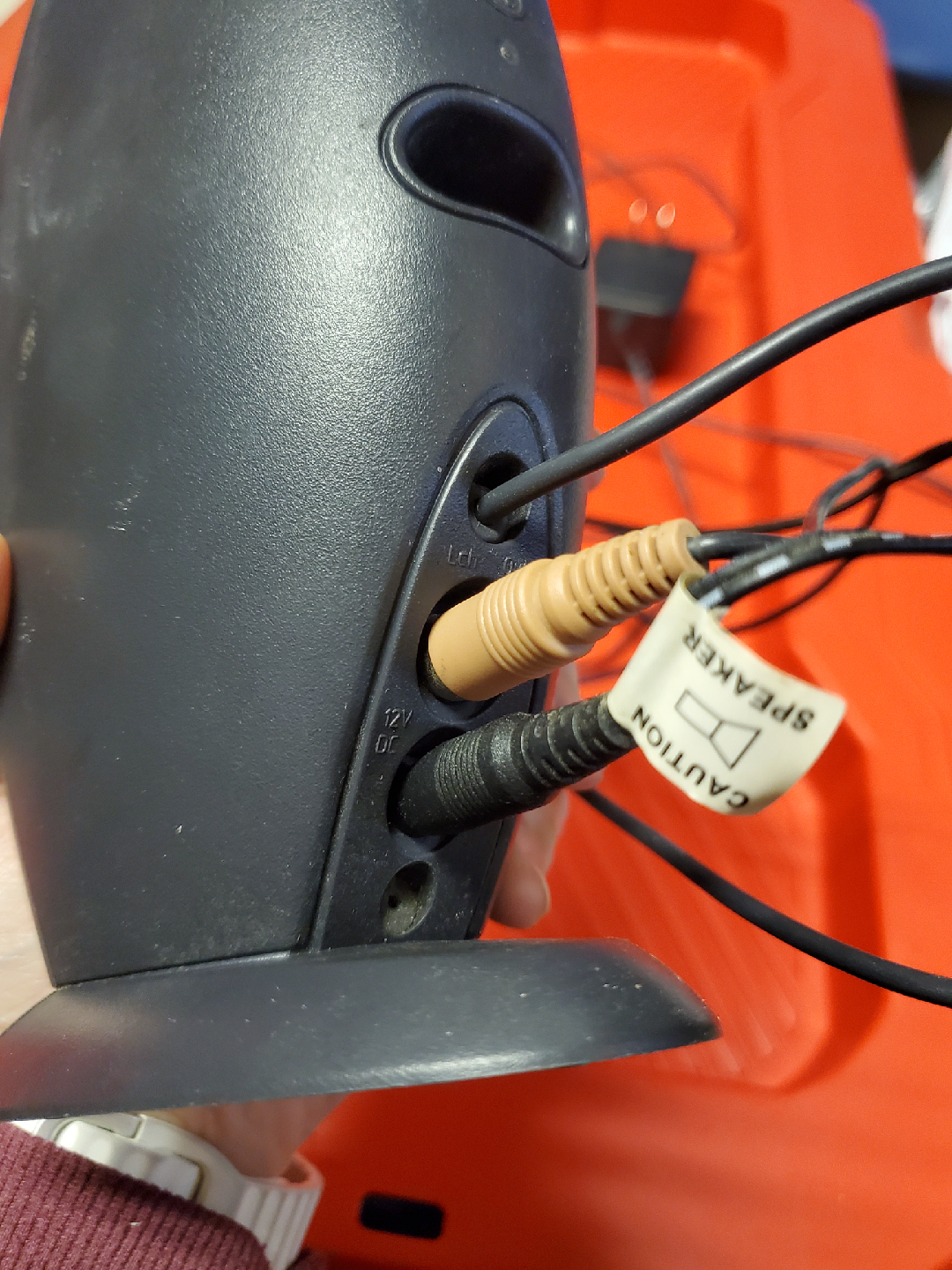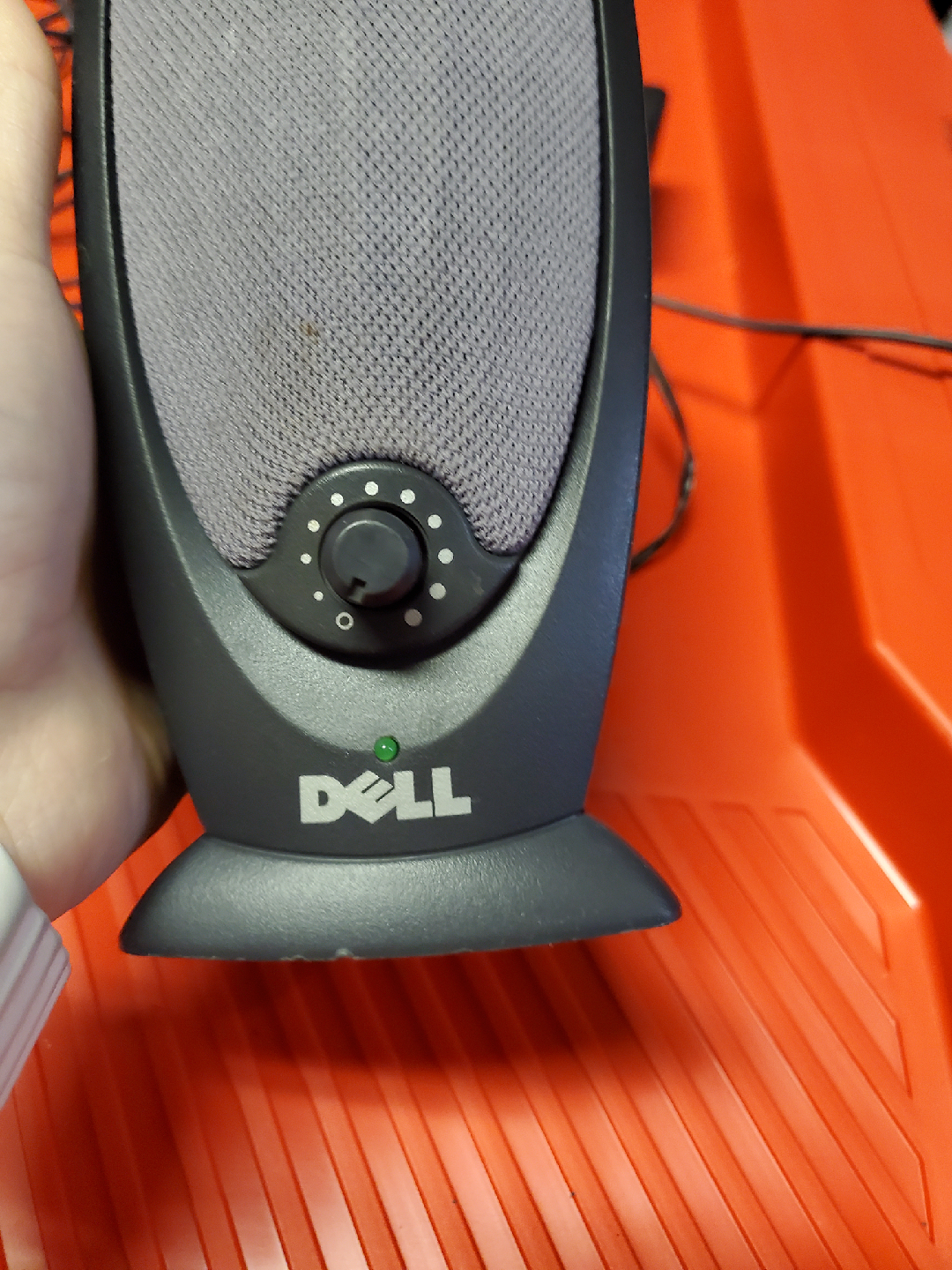 Selling a set of Dell speakers. They are black and grey. They have a volume control knob on the front. Includes speaker cables.