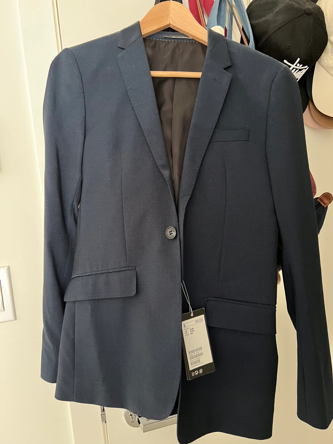 Selling a stylish navy blue blazer from H&M. It's a size 34R and still has the original tag attached. Originally priced at $100