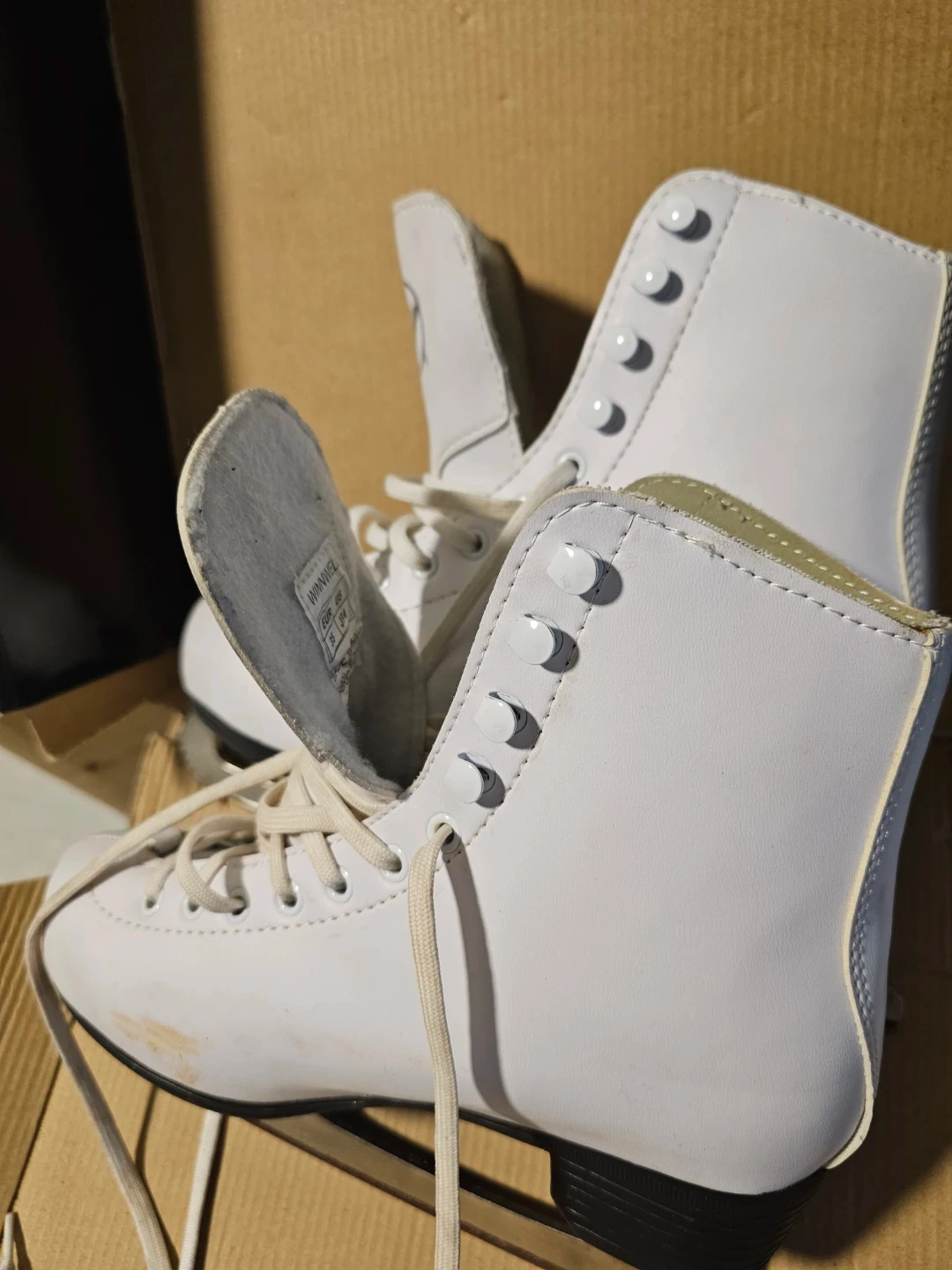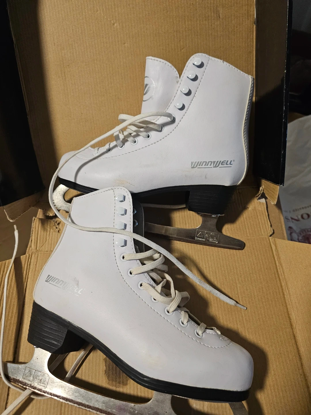 Winwell white figure skates are a great option for beginner skaters. They feature a supportive boot with laces for a secure fit. The blades are made of durable metal for long-lasting use.