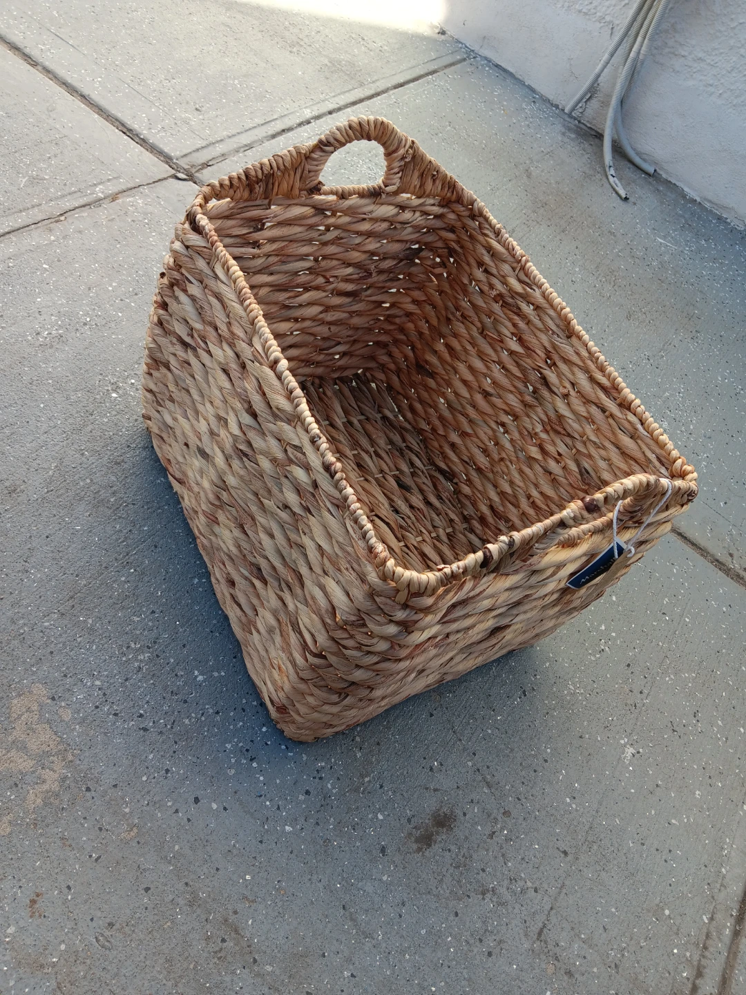 I'm selling a woven storage basket! It's in great condition and ready to hold your items. The basket is made of natural material and has a handle for easy carrying