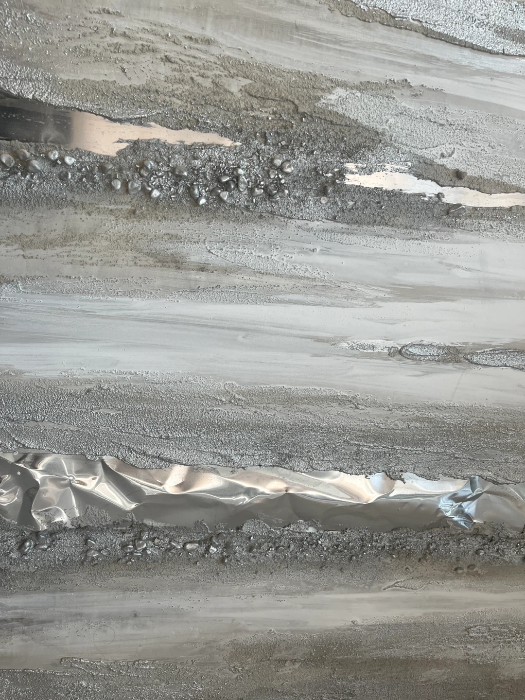 This canvas wall art features a textured abstract design in shades of grey, white, and silver.