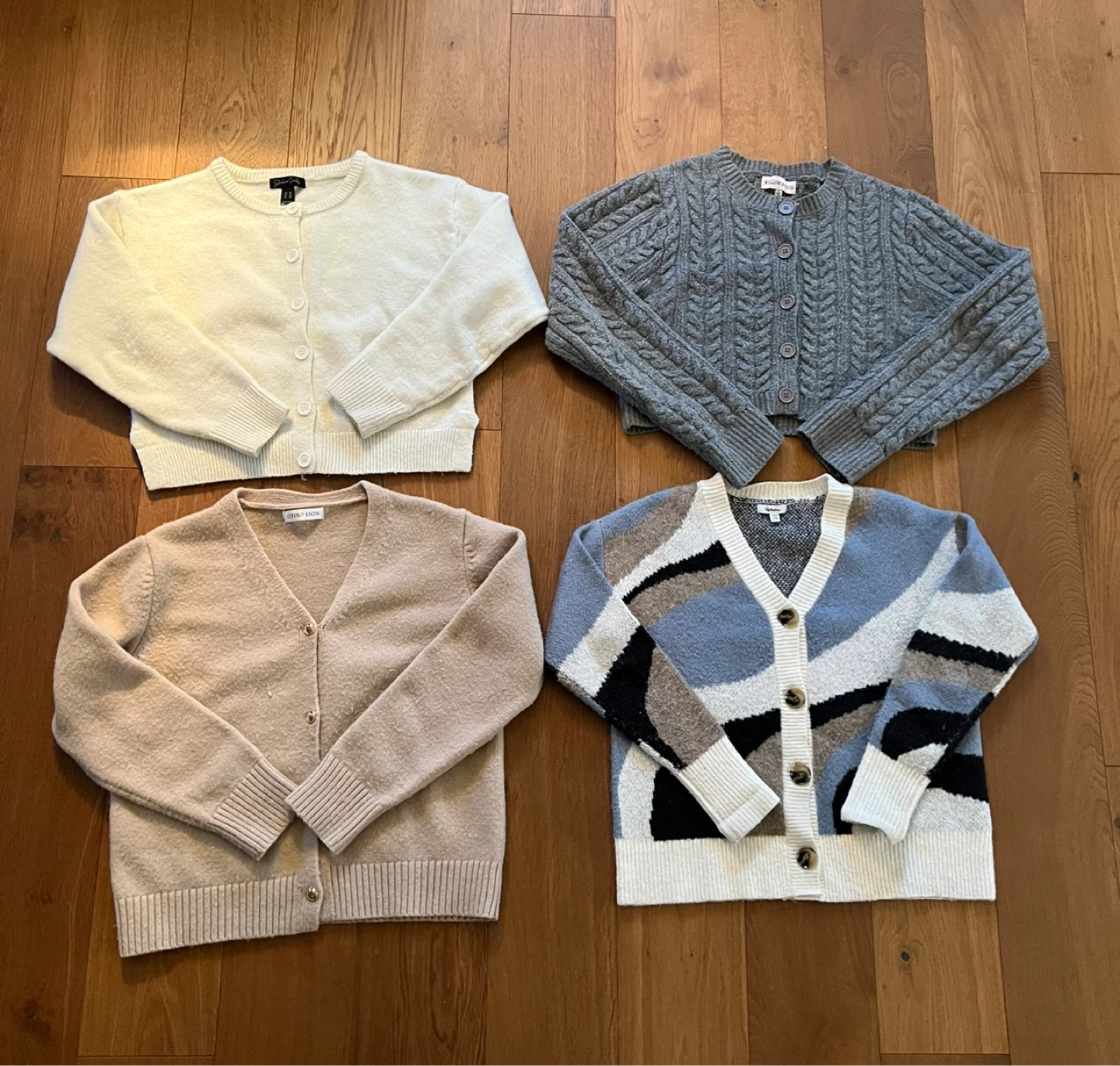 Selling a bundle of gently used cardigans in various styles and colours! There is a cream cardigan from Joe Fresh, a light brown cardigan from Tristan & Iseut, a grey cardigan from Lucky Brand, and a blue patterned cardigan. Perfect for layering during the cooler months!