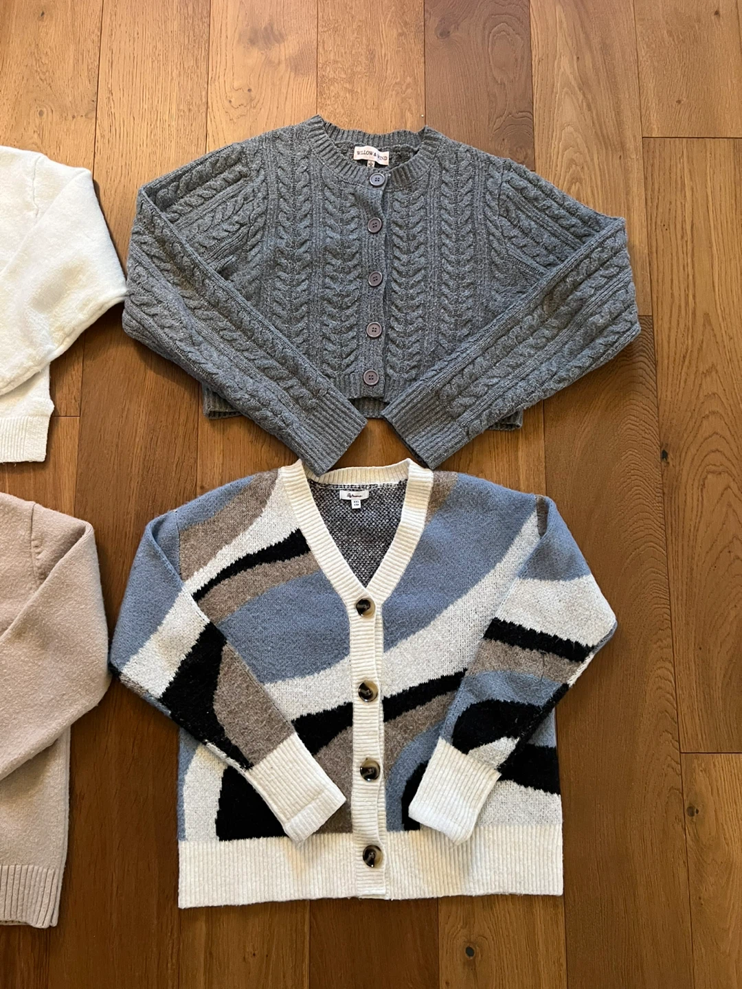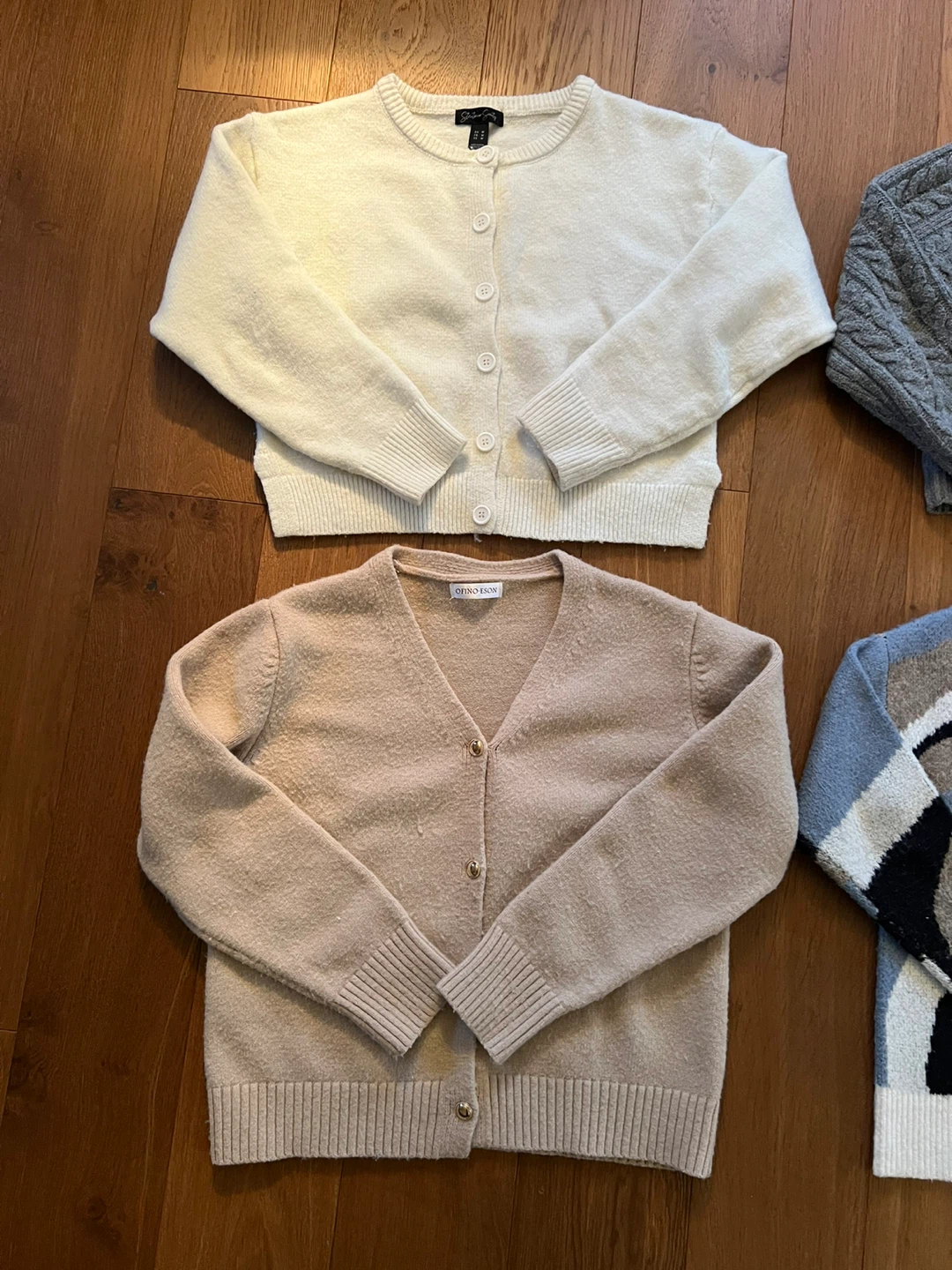 Selling a bundle of gently used cardigans in various styles and colours! There is a cream cardigan from Joe Fresh, a light brown cardigan from Tristan & Iseut, a grey cardigan from Lucky Brand, and a blue patterned cardigan. Perfect for layering during the cooler months!