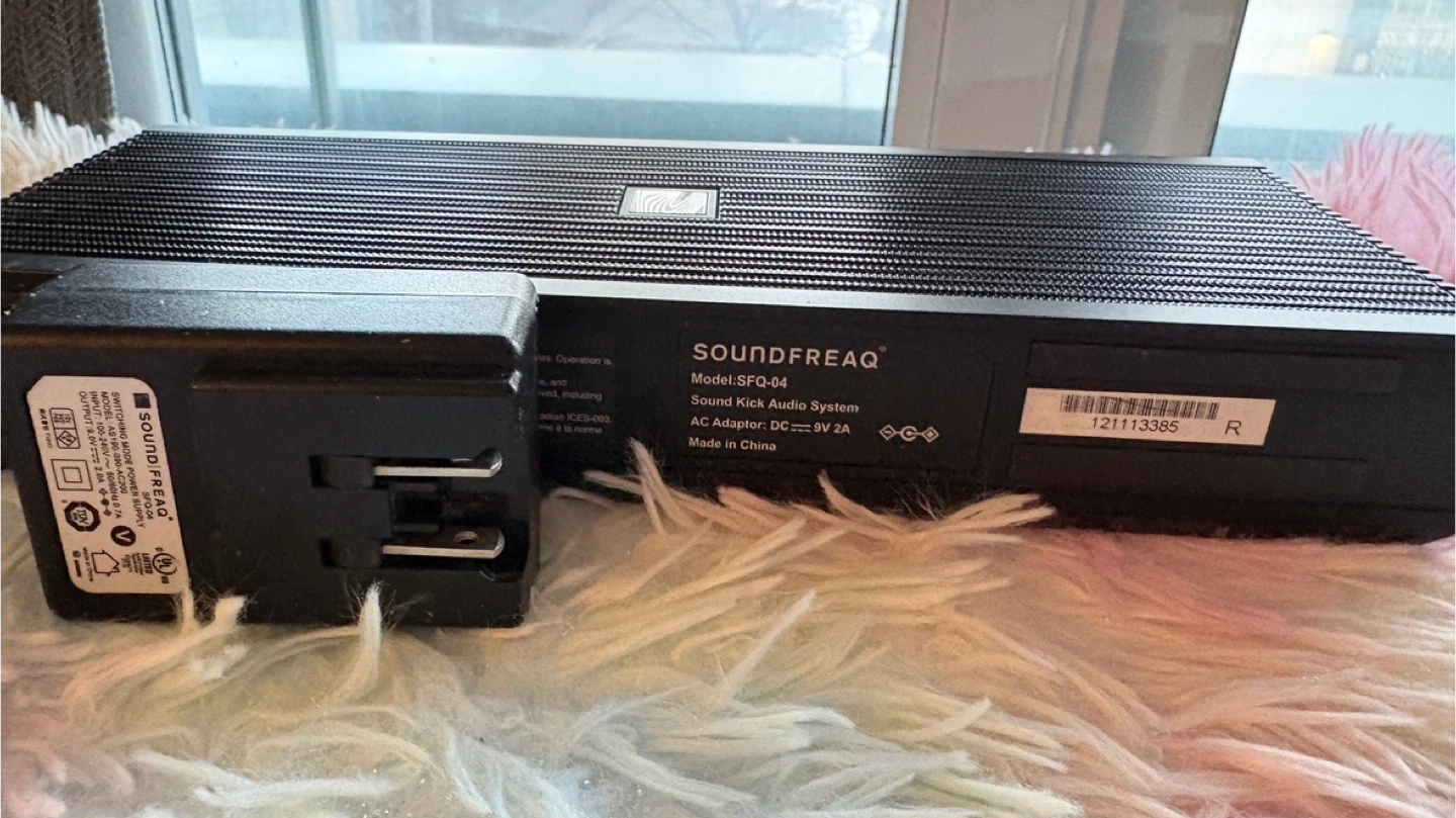 This is the Soundfreaq SFD-04 Sound Kick Audio System. It features AC adapter input with DC 5V 2A output. It also has a USB port and AUX-in for versatile connectivity.