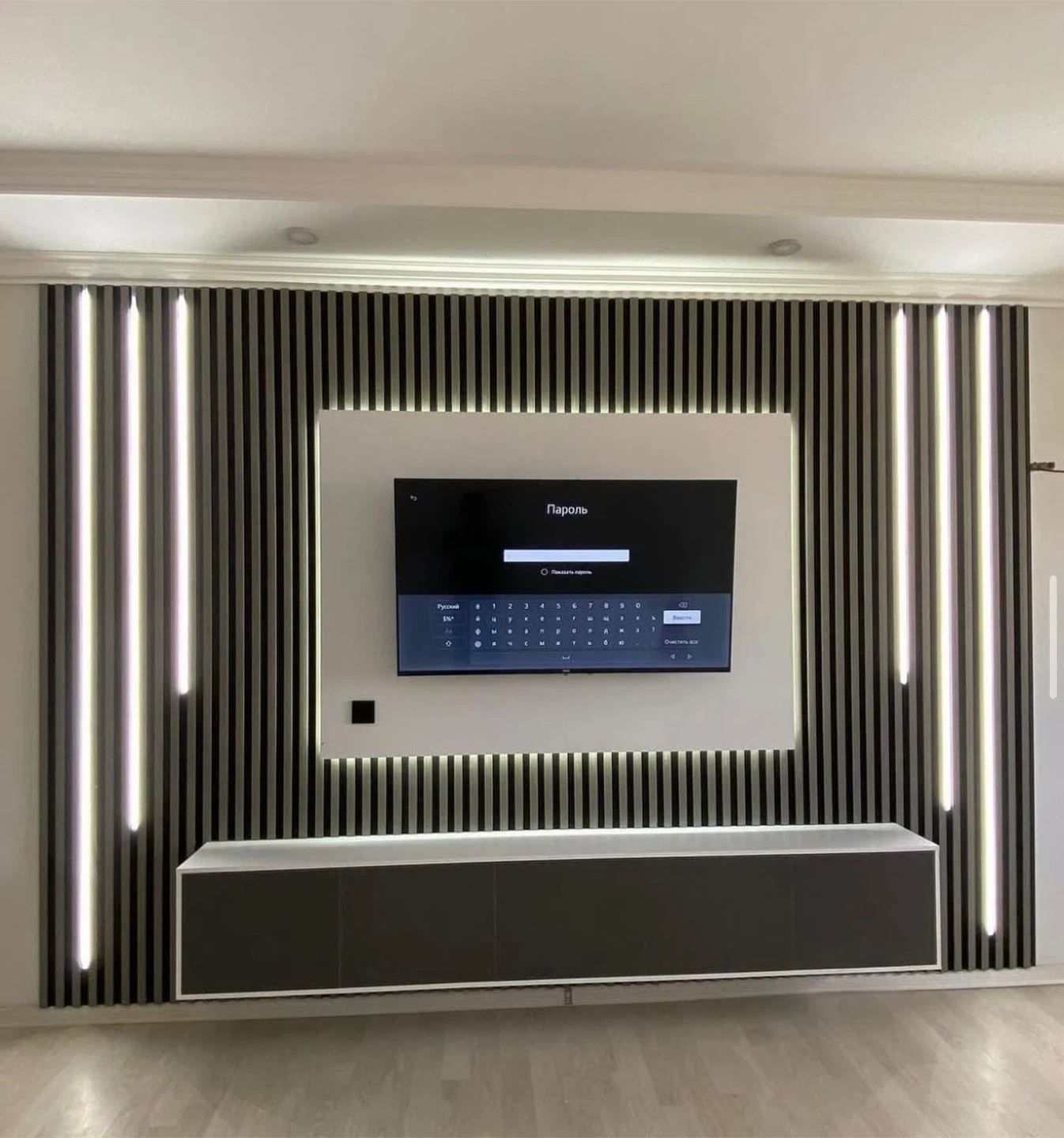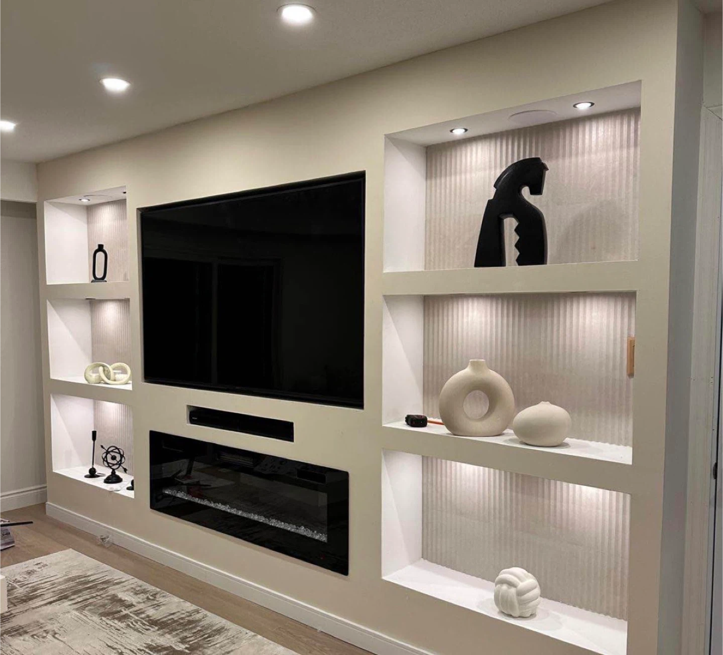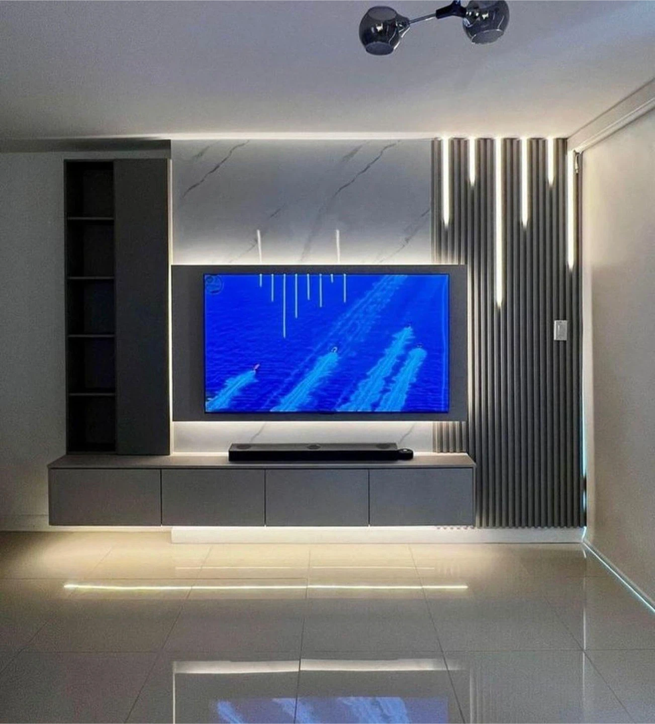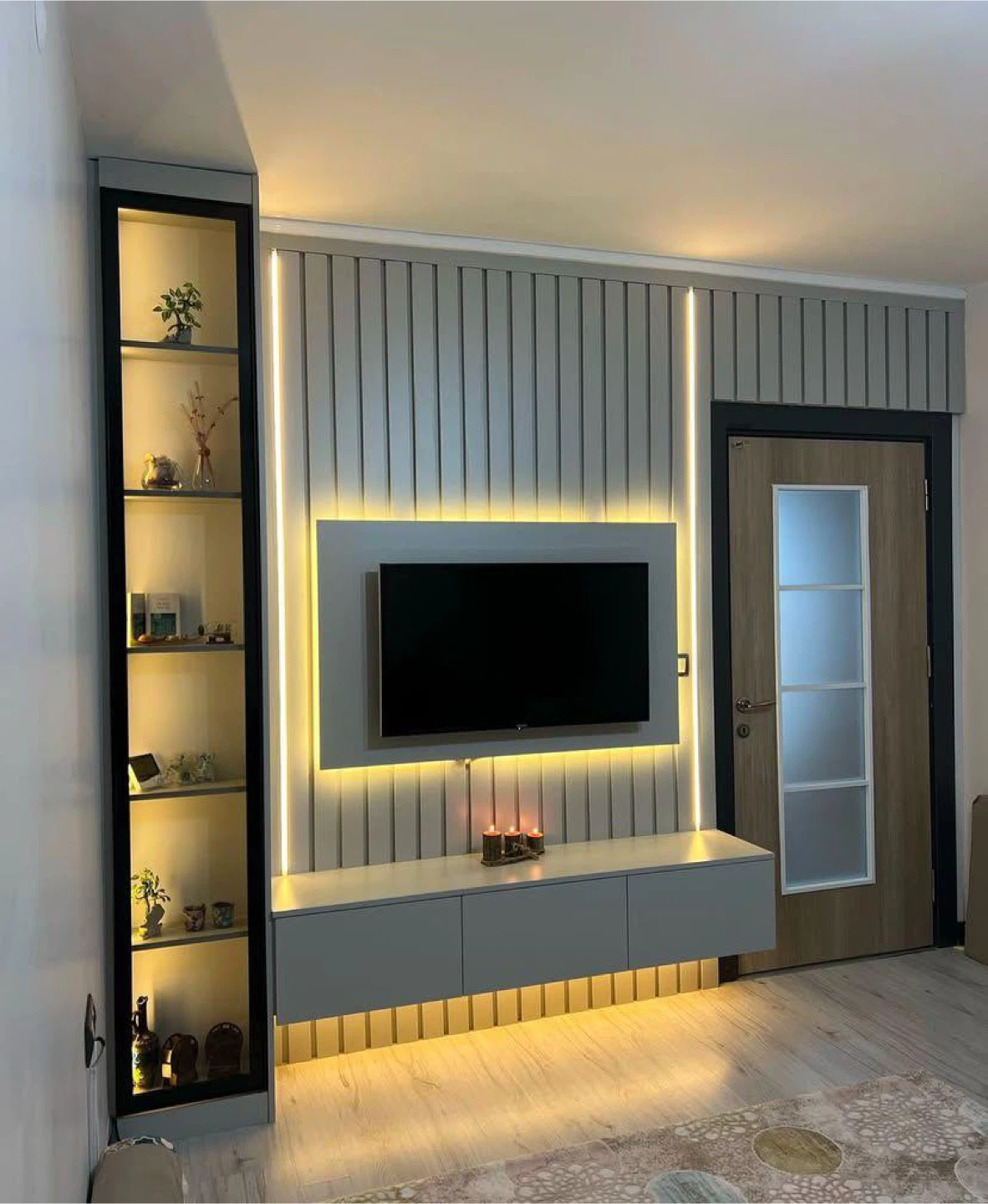 Looking to upgrade your living room? This custom TV wall unit features integrated lighting for a modern and stylish look. Perfect for creating a cozy and inviting entertainment space in your home