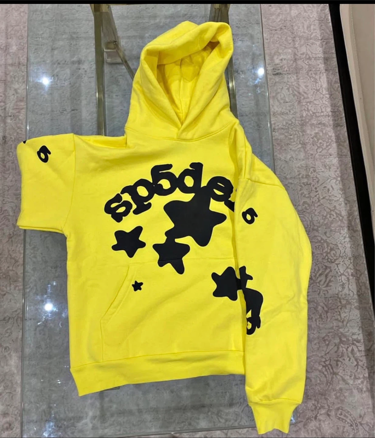 Bright yellow hoodie featuring a bold black 'Sp5der logo and scattered star graphics. It has a front pouch pocket and a drawstring hood. Cotton blend material for comfort.