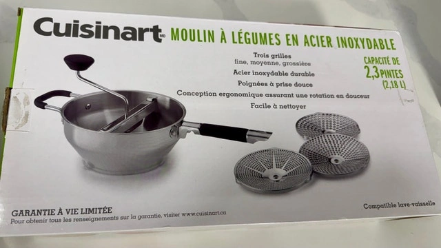 New Cuisinart stainless steel food mill with 2.3 quart capacity. Comes with three cutting discs (fine, medium, coarse). Features soft-grip handles and is dishwasher safe. Great for making mashed potatoes, purees, sauces, and baby food. Never used, still in box.