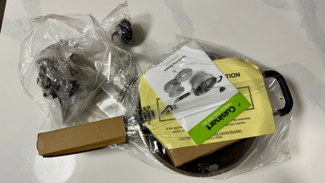 New Cuisinart stainless steel food mill with 2.3 quart capacity. Comes with three cutting discs (fine, medium, coarse). Features soft-grip handles and is dishwasher safe. Great for making mashed potatoes, purees, sauces, and baby food. Never used, still in box.